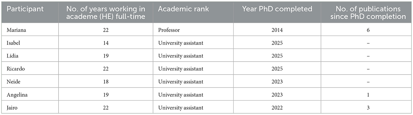 This qualitative research is based on information collected between December 2024 and February 2025 from seven academics working in Mozambican higher education in Maputo. Since diverse academic disciplines have different professionalization processes and practices, it is important to note that all the informants were located in social and life sciences disciplines. They were selected purposively on the basis that they were in full-time academic employment, meaning that conducting research was one of their core tasks. Three participants were in the process of completing their PhDs at the time of writing this article. Certain of their core characteristics relevant to this study are detailed in Table 1. These characteristics will be further commented on in the “Findings and discussion” section.