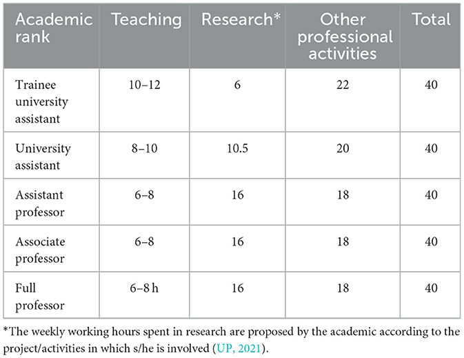 We employed qualitative methods to arrive at our data through a process of participative co-production of knowledge (Redman et al., 2021; Conde and Walter, 2022) in the research design, the data collection and its interpretation. This involved a series of online focus groups lasting about 1 h each with the selected participants in which we discussed the focus of the study, the issues we wished to cover, how to collect the relevant data, and what those data told us. The data were collected through the following steps: participants were asked to identify in written free form how they spent their work time and how many hours they actually spent on different aspects of their work. This resulted in a number of individual and individualized accounts of their workloads. Following a subsequent focus group meeting to discuss these, we then created a grid that included all the work-related headings they had generated in the first round and they re-checked their information and amended it as necessary. The headings (e.g., “Teaching,” “Research,” “Admin,” “Outreach”) were largely standard headings for academic work in higher education. The headings functioned as themes under which the participants then recorded more detailed information such as “5 h seminars per week.” We performed a grid analysis, discussing the grid data in a further focus group meeting and the participants again amended their information. Some participants had, for example, given very precise hours, others less so. Participants also found that in the focus group discussions they remembered work they did that they had simply forgotten about such as sitting on committees, or attending particular meetings. The sheer number of different tasks they undertook could be hard to recall individually but surfaced in collective discussions. It also became clear that there were issues that impacted on the participants' ability to do research that had less to do with the actual hours spent and much more to do with how and by whom their worktime was structured. We discuss this in detail in the “Findings and discussion” section. The data interpretation proceeded through further focus group meetings between which the write-up of the research and its refining were conducted. Here the first author took the lead, with focus group members reading the text as it progressed and providing both individual comments and discussion points in the ongoing focus groups meetings. This intense, iterative process over several months ensured equal participation by those involved in the research and secured the veracity of the research from the participants' perspective.