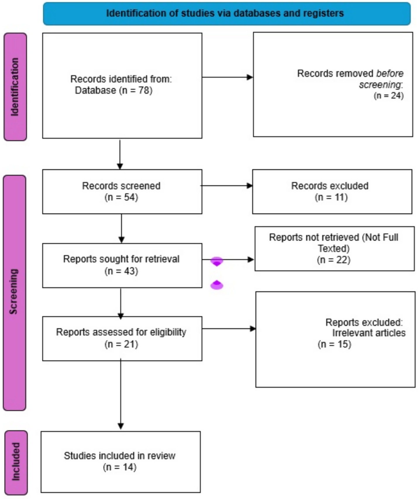 A search strategy was developed based on the criteria. According to that strategy, a list of reputed publishers was developed, and each database was searched for the relevant studies. The whole process took 10 days from 2 June 2025 to 12 June 2025. The initial investigation presented 78 studies, and among them, 24 were removed before screening. Among the remaining 54 records, 11 were excluded, and the remaining 43 were further screened. Twenty-two records were excluded again as their text was not available. From the remaining 21, 7 articles were removed as their themes were different, and the final 14 studies were considered for the review as presented in Figure 1.