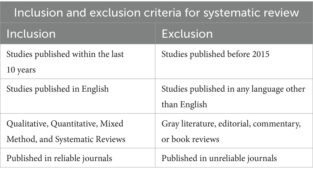 The process of reviewing articles started with setting the inclusion and exclusion criteria. The articles published within the last 10 years were considered for review. The inclusion and exclusion criteria were developed by two academic experts, with the assistance of one expert librarian. The committee of experts also provided ethical approval. Table 1 shows the criteria.