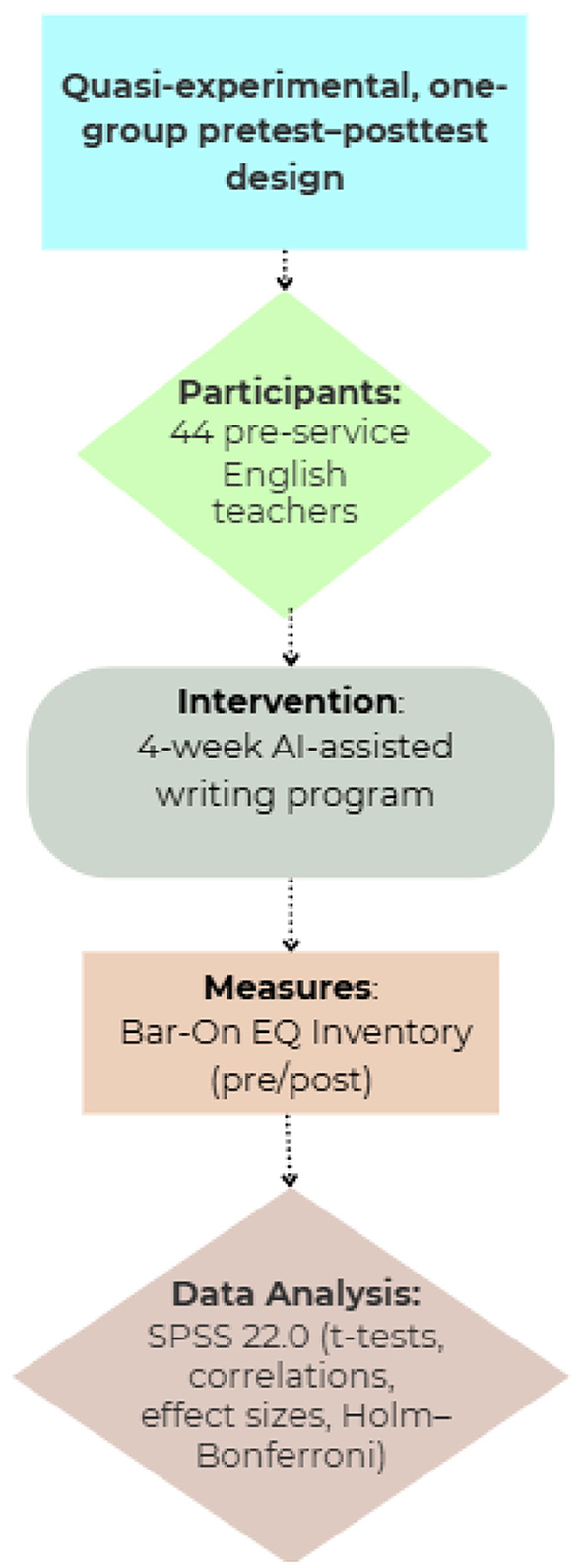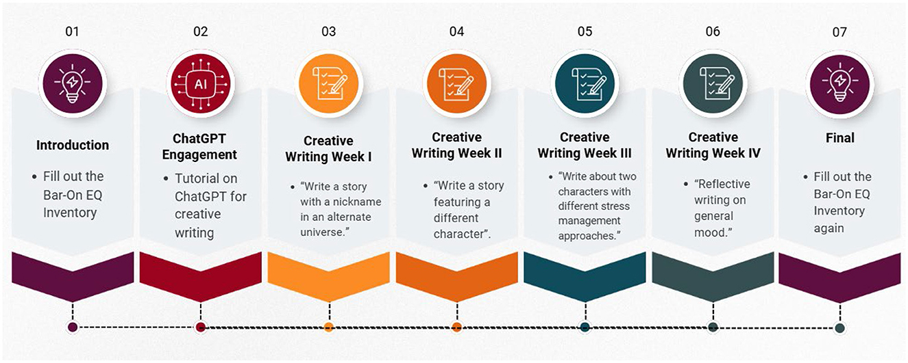 The study is composed of three stages: pre-test, intervention, and post-test. The seven-step procedure was followed during the intervention which was illustrated in Figure 2. Step 1: participants completed the Bar-On EQ Inventory. Step 2: A tutorial introduced ChatGPT for creative writing. Steps 3–6: participants engaged in weekly supervised creative writing tasks, each aligned with an emotional intelligence (EI) subscale (Week 1 = intrapersonal, Week 2 = interpersonal, Week 3 = stress management, Week 4 = general mood). Step 7: participants completed the Bar-On EQ Inventory again at the end of the program.