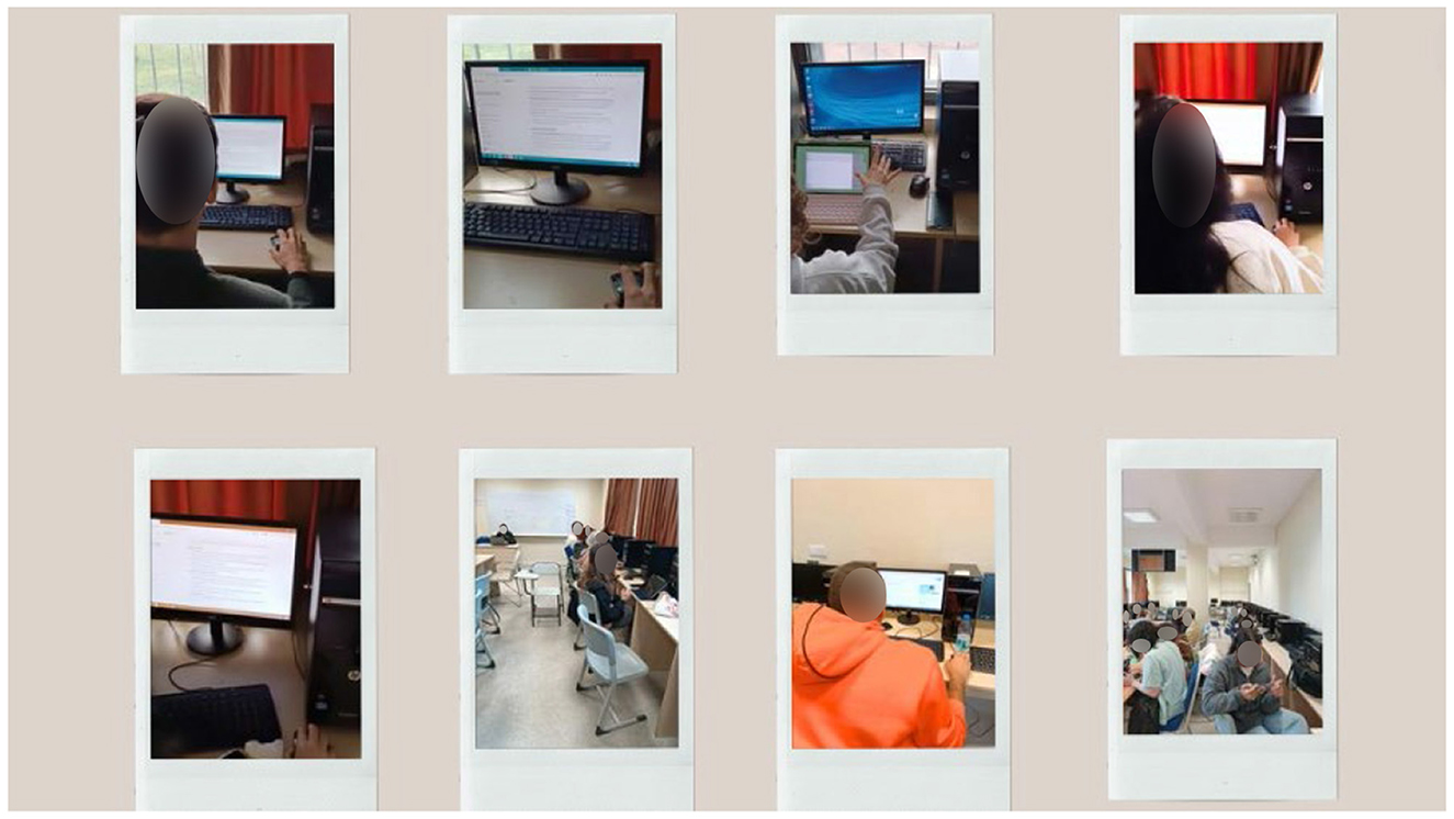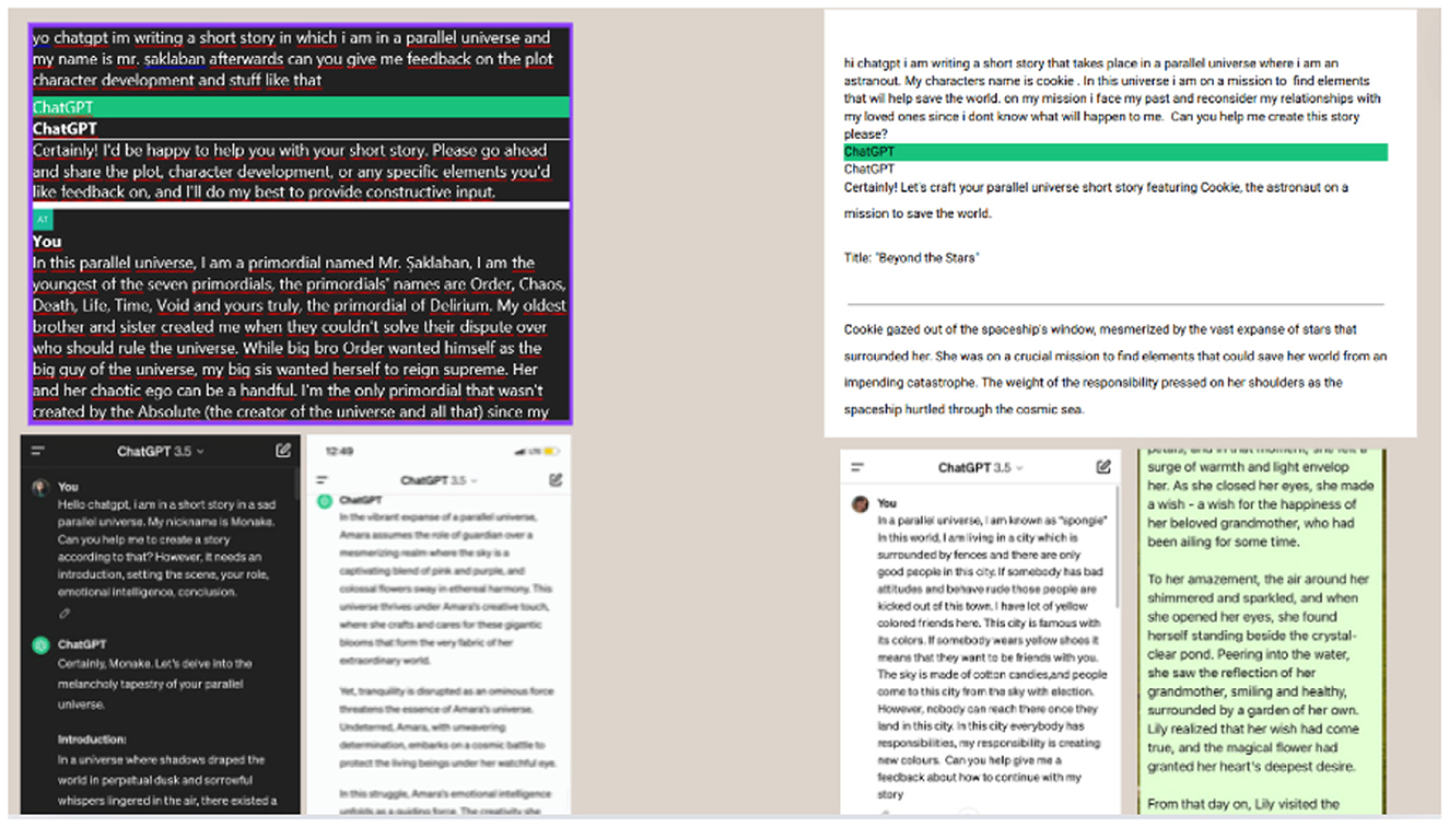 b. Engagement period: The intervention lasted 4 weeks, with one supervised session per week, each lasting approximately 60 min. In each session, participants engaged in a writing task aligned with one of the EQ-i dimensions (intrapersonal, interpersonal, adaptability, stress management, general mood). The practical implementation of this process is illustrated in Figure 3, which presents photographs from the classroom sessions alongside examples of student–ChatGPT writing interactions. The writing prompts were designed to gradually increase in complexity: early sessions focused on creative story writing (e.g., imagining themselves as characters in alternate universes), while later sessions emphasized more reflective or problem-solving tasks (e.g., writing dialogues between characters with different stress-management strategies or reflective writing on general mood). Participants interacted with ChatGPT iteratively during these tasks. Typically, they began by submitting an initial prompt (for example, “I am writing a story that takes place in a parallel universe where I am an astronaut… Can you help me create this story?”). ChatGPT then generated narrative continuations, which participants could expand, revise, or redirect through further prompts. Over the course of the sessions, each task included 6–10 interactions, with ChatGPT acting as a co-writer and idea generator rather than the sole author. On average, each participant produced 300–500 words per task, with the final output reflecting both participant contributions and chatbot-assisted elaboration. All sessions were supervised by the researcher to ensure consistent engagement, troubleshoot technical problems, and safeguard the integrity of the process. Supervision also ensured that ChatGPT was used to stimulate creativity and provide feedback rather than to replace participants' own writing. The screenshots of writing interactions between participants and ChatGPT during the 4-week intervention were provided in Figure 4.