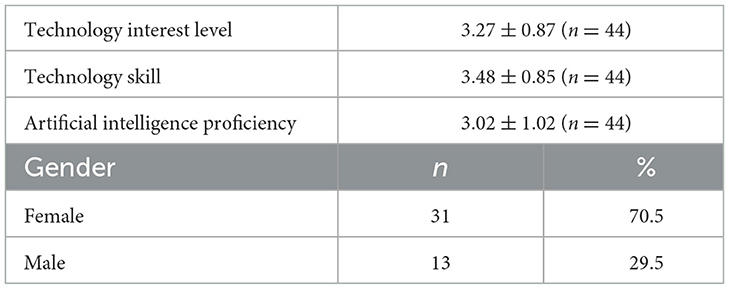 The participant cohort consisted of pre-service English language teachers enrolled at a state university in Istanbul, Türkiye. A total of 44 participants (see Table 1) were selected as the sample through convenience sampling, based on practical criteria such as ease of access, geographical proximity, availability at a specific time, or willingness to participate (Sedgwick, 2013). A sensitivity analysis conducted in G*Power for a paired-samples t-test (α = 0.05, two-tailed, power = 0.80) indicated that with n = 44, the study was sufficiently powered to detect moderate effect sizes of dz ≥ 0.38. In order to demonstrate that they were voluntarily involved in the research project and that they comprehended the purpose of the research to confirm their voluntary participation in the research project and their understanding of its purpose, participants were asked to submit a written consent document. Furthermore, they were guaranteed that this research endeavor would not impact their academic records or career aspirations. In an effort to enhance ethical adherence, participants were properly briefed on the confidentiality of their data and their entitlement to resign from the study at any given time without facing any consequences.