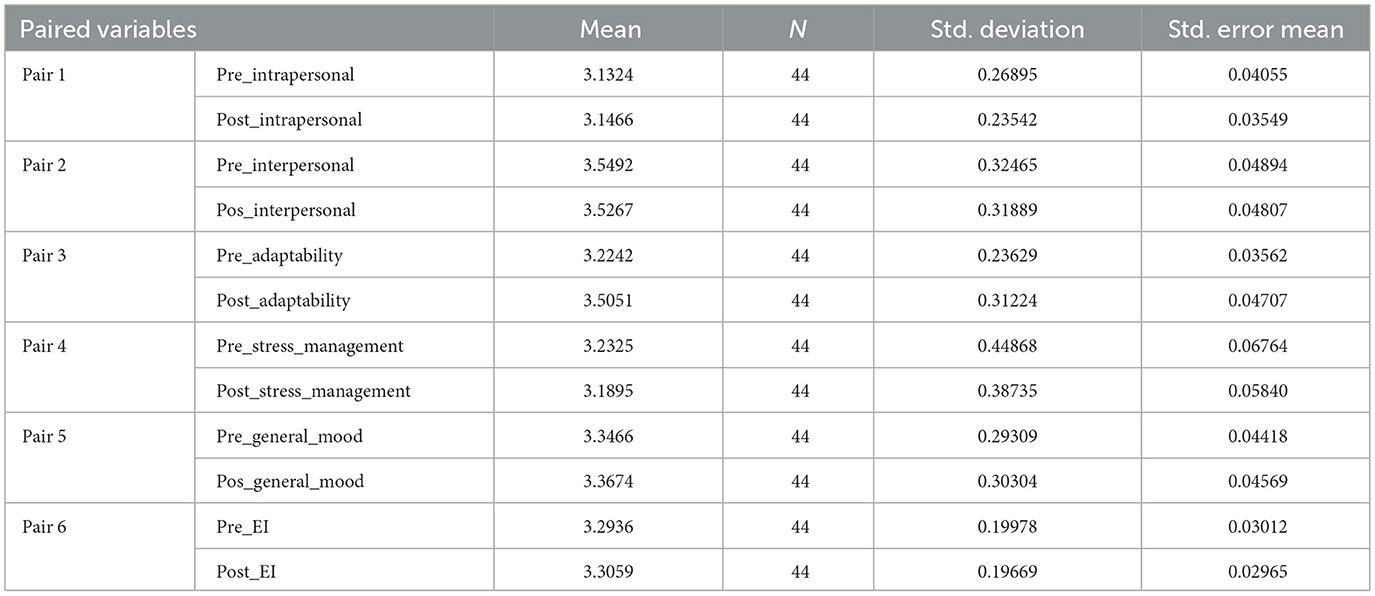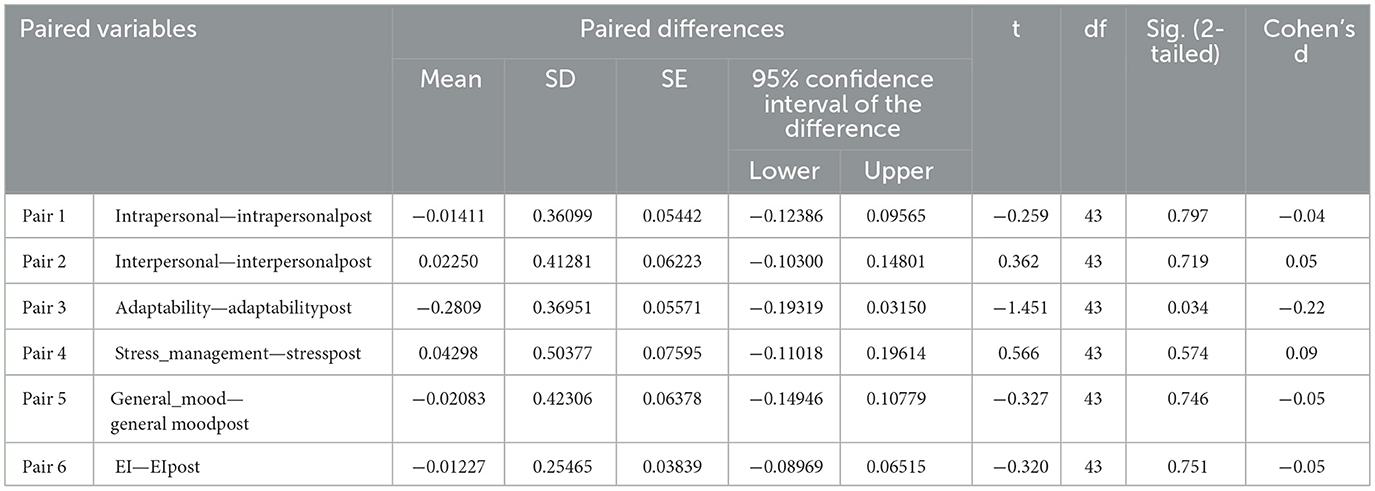 The paired sample t-test was applied to examine whether there was a difference in the mean scores applied at different times by the same people. Table 2 shows descriptive statistics on pre-test and post-test results obtained from emotional intelligence, intrapersonal, interpersonal, adaptability, stress management, and general mood scales. Shapiro–Wilk tests indicated that both pre-test (W = 0.969, p = 0.283) and post-test (W = 0.950, p = 0.055) EQ-i total scores did not significantly deviate from normality, supporting the use of parametric analyses. A paired-samples t-test on the EQ-i total scores revealed no significant change from pretest (M = 285.27, SD = 17.07) to posttest (M = 286.00, SD = 17.22), t(43) = −0.20, p = 0.839, 95% CI (−7.91, 6.45). The effect size was negligible (Cohen's d = 0.03), suggesting minimal overall change in emotional intelligence levels.
