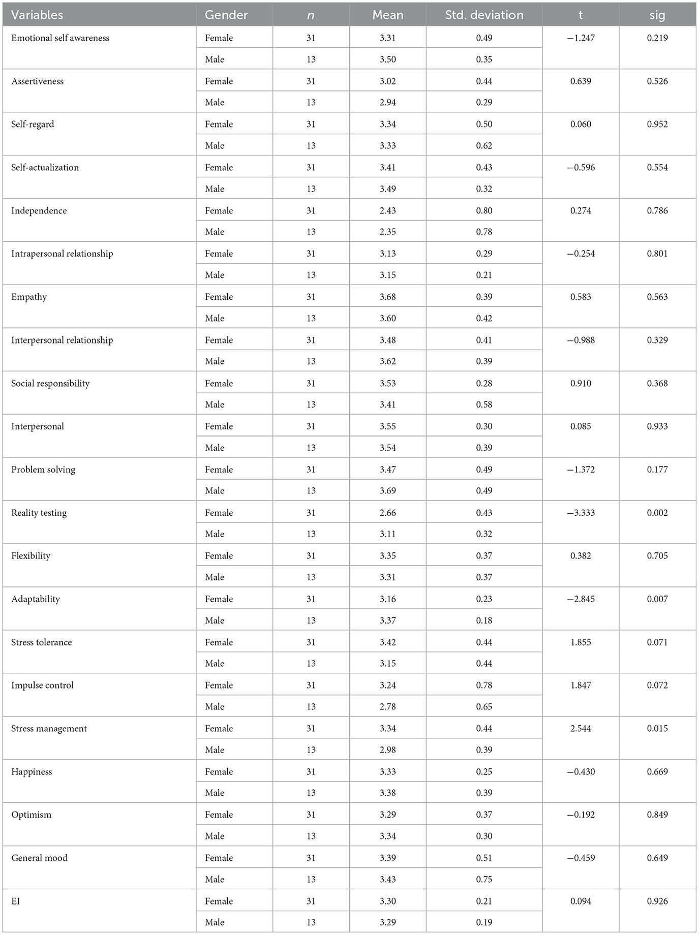 When the Table 4 was examined, it was seen that the mean scores of reality testing, adaptability and stress management during the intervention differed according to the gender variable (p < 0.05). While the mean reality testing and adaptability scores of males were statistically significantly higher than females, the mean stress management scores of females were higher than males. In terms of intrapersonal, interpersonal, and general mood, male and female participants showed similar tendencies.
