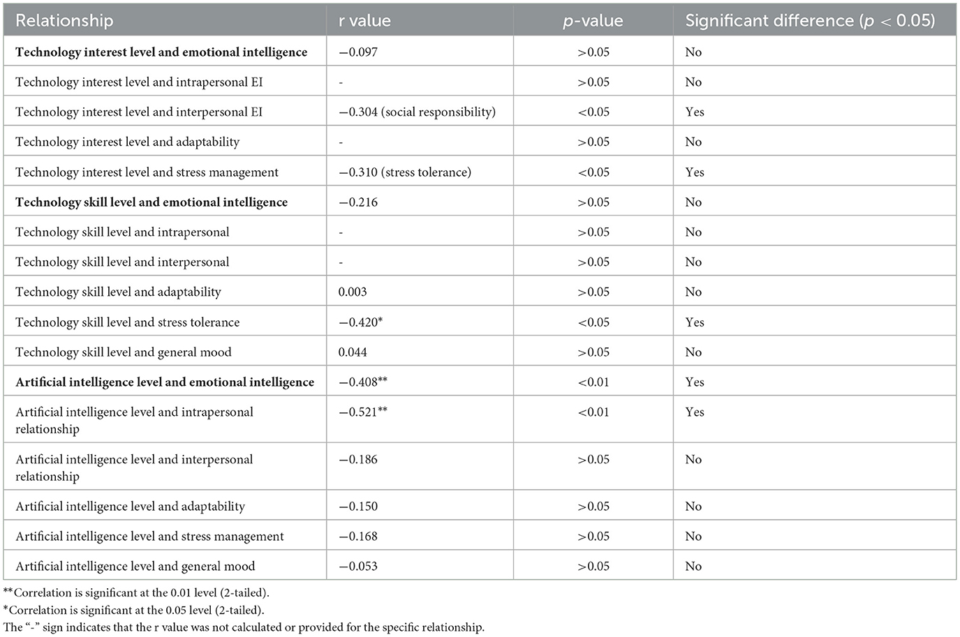Likewise, no significant correlation was found between technology skill level and emotional intelligence (r = −0.216, p > 0.05), nor between technology skill level and interpersonal or intrapersonal emotional intelligence (r = -, p > 0.05). There was also no significant relationship between technology skill level and adaptability (r = 0.003, p > 0.05). However, a notable negative correlation was found between technology skill level and stress tolerance (r = −0.420, p < 0.05).