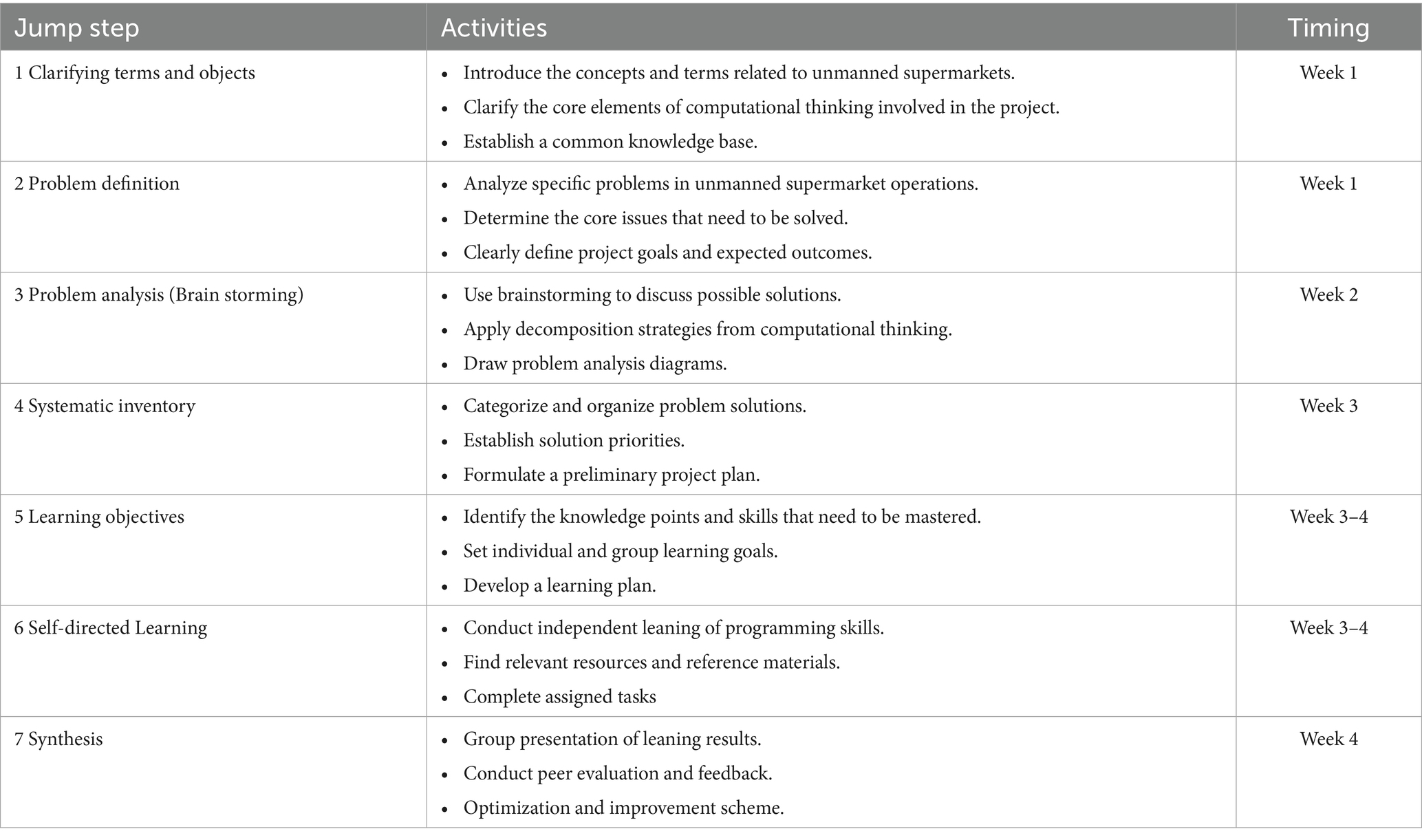 The integration of PBL and computational thinking creates a collaborative learning environment that is particularly effective for problem solving using CT skills (Bell, 2010; Grover and Pea, 2013). In this study, PBL is used to create a synergistic learning environment where students develop both CT and creative thinking skills. For example, in the “unmanned supermarket” project, students naturally employ fundamental CT skills, including decomposition, pattern recognition (identifying repetitive elements in retail operations) and algorithmic thinking (designing step-by-step solutions for automated processes) (Blumenfeld et al., 1991; Bers, 2020).