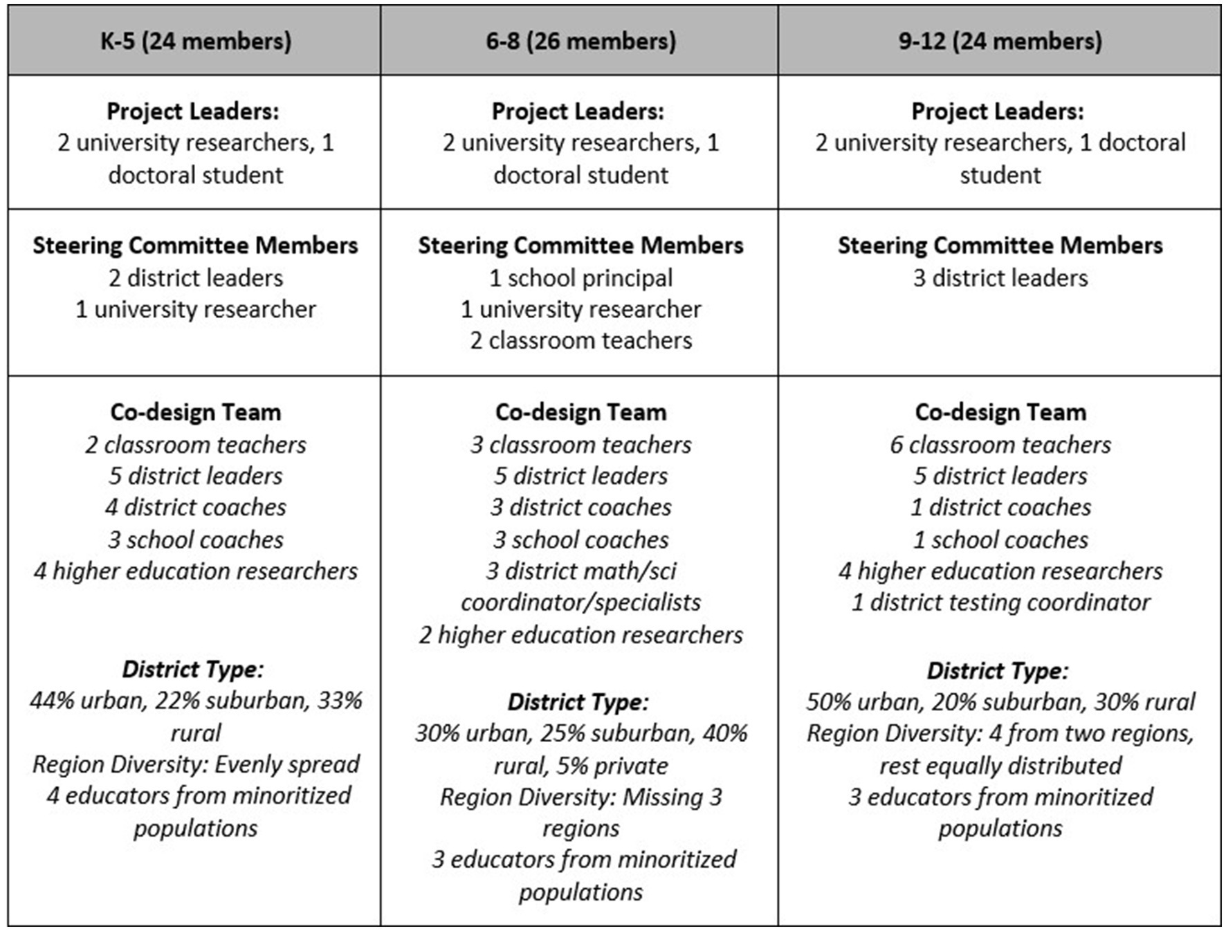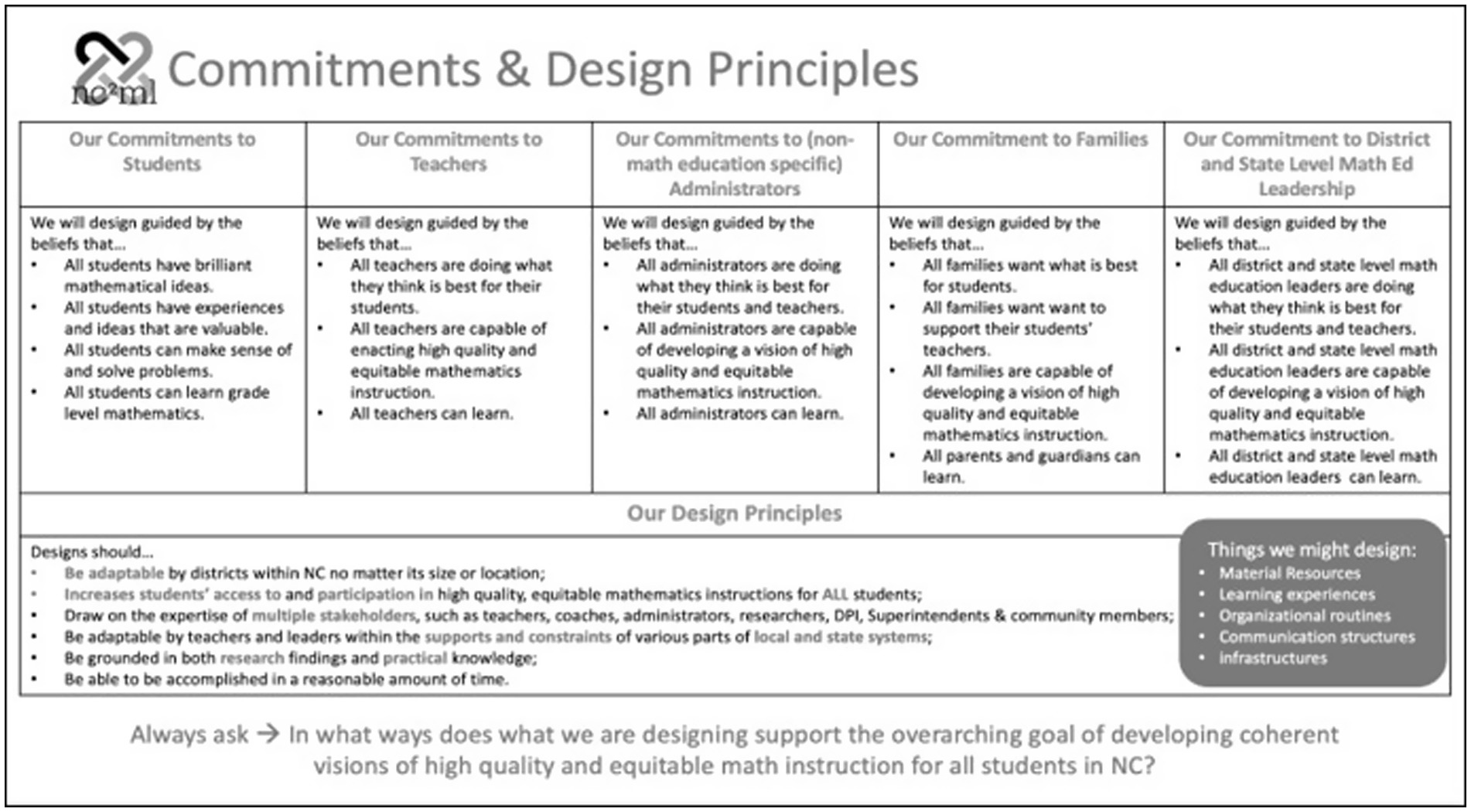In this article, we use the ongoing work of the North Carolina Collaborative for Mathematics Learning [NC2ML], referred to as Mathematics Collaborative from heretofore, to identify discontinuities that arise when bringing together individuals from multiple educational communities to engage in joint work around choosing a shared statewide problem. The Mathematics Collaborative is a large scale research practice partnership of researchers from 13 [State North Carolina] universities, mathematics educators from the state education agency and over 300 state, district, and school-based leaders and mathematics teachers. It is large scale in the sense that it involves researchers and practitioners from different types of school districts (rural, urban, suburban), participants representing a variety of roles (state education agency, researchers, K-12 educators), and covers a large geographical area (state of NC) comprised of dozens of smaller educational systems (115 school districts). The partnership formed in 2016 when the state began adopting new K-12 mathematics standards and has taken a design-based implementation research approach (Fishman et al., 2013) to collaboratively develop implementation resources, create professional learning materials, and grow a state-wide infrastructure that supports mathematics teaching and learning through networking and advocacy. During this time, project leaders noticed that there was little coherence in the way the new standards were being implemented across the state, with only a few pockets doing so in ways that are consistent with National Council of Teachers of Mathematics (2014) vision of high quality, equitable mathematics instructional practices. Thus, in 2021, the Mathematics Collaborative shifted from co-designing for state-wide standards implementation to co-designing to promote a shared vision of high quality, equitable mathematics instruction (VHQEMI) due to a perceived lack of common instructional vision. To this end, the partnership formed three Co-design Teams, one at each of the three grade bands (K-5, 6–8, 9–12). Each of these smaller teams began the process of identifying a state-wide problem of practice that, from their perspective, has resulted from disparate instructional visions across the state educational system.