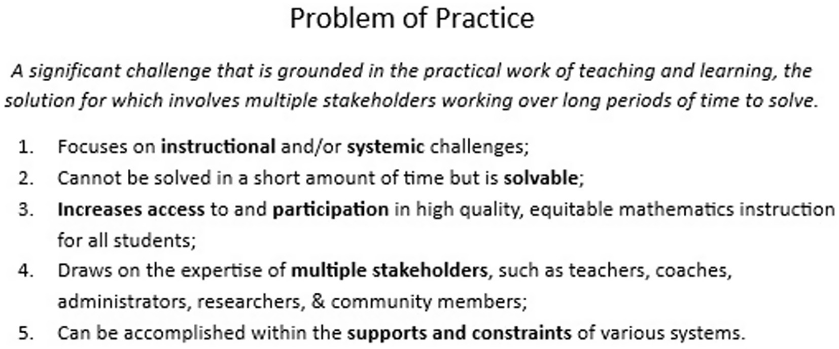 The Steering Committees used Mathematics for Human Flourishing (Su, 2020) and virtual meetings to begin building a collaborative design environment, discuss the importance of shared vision of HQEMI, and better define for co-designers what is meant by a problem of practice. Identifying a problem of practice at state scale was new to all retreat participants, including the Project Team. When thinking about how our partners design professional development and classroom instruction, we realized that the problem to be addressed by their PD or lessons is typically defined for them and is often situated within a relatively local context. Considering the novelty of beginning the work before a PoP has been identified, the Project Team sought to design tools that would bring structure and guidance to the process of defining a problem and eventually developing resources to address it. On day one of the summer retreat, all members were introduced to a set of Commitments and Design Principles (Figure 2) and Characteristics of Problems of Practice (Figure 3) that were meant to initiate negotiations around a set of norms for co-designing for a state education system.