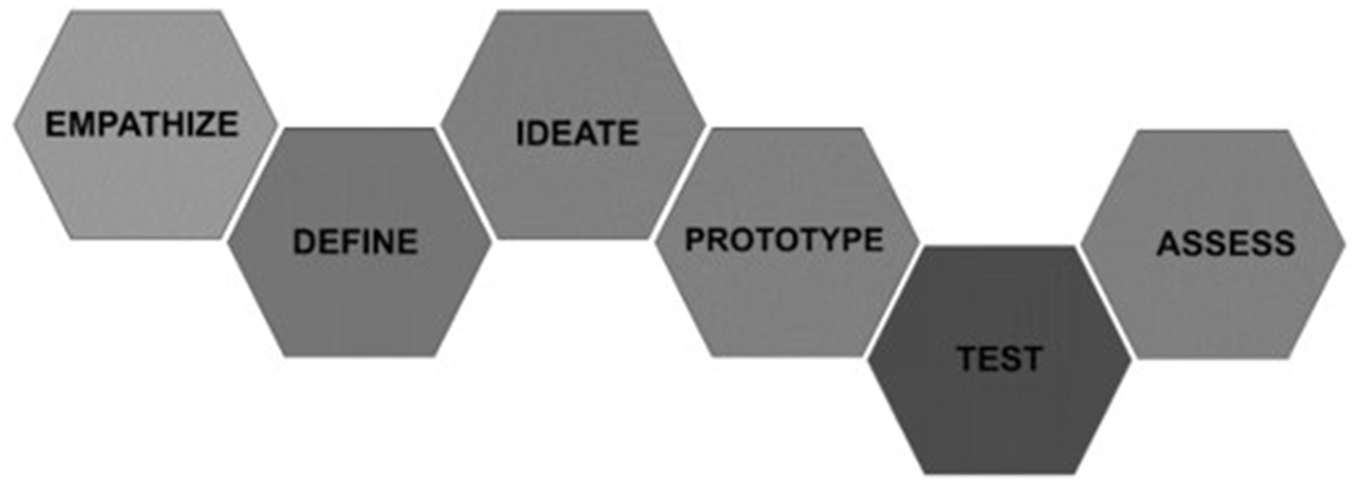 Another artifact introduced by the Project Team was an image of the design process (d.school, 2018) showing the six stages of design within hexagonal regions (Figure 4). This artifact was meant to situate current work of the design teams within the larger iterative process of design and was posted in each Co-design Team room. This artifact/process was designer-introduced, yet as we will see in the findings section, participants’ use of this tool varied. We anticipated that a large portion of the summer work would be devoted to the empathize (attending to the voices of the people for whom you are designing), define (identifying/defining a PoP) and ideate (brainstorming solutions to the PoP) stages of the design process with prototyping, testing and assessing to occur in the fall.
