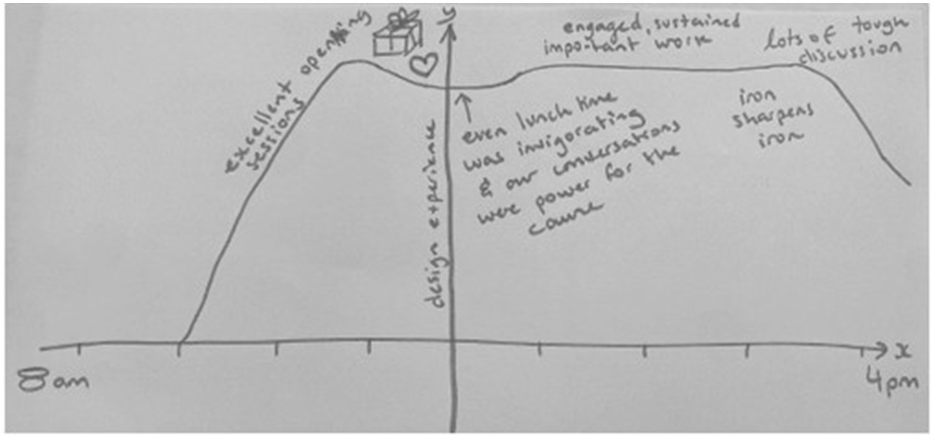 The first strategy implemented by the Steering Committee and Project Leaders involved intentionally using formal and informal opportunities to read the room and understand how team members were feeling about the process. To gage team members’ sense-making and feelings during the sessions, the Steering Committee asked co-designers to draw a graph of a day in the life of a designer in their Notebooks and explain high/low points each day. The daily graphs allowed Steering Committee members to understand when team members were frustrated and why. Generally, low points occurred when there was uncertainty about where the group was headed or how long the process was taking. Many were ready to get started creating resources. Evidence of this tension can be seen in the Day 2 reflections of one Co-design Team member who indicated that it was frustrating not to start the second day with a well-defined problem of practice (Figure 7).