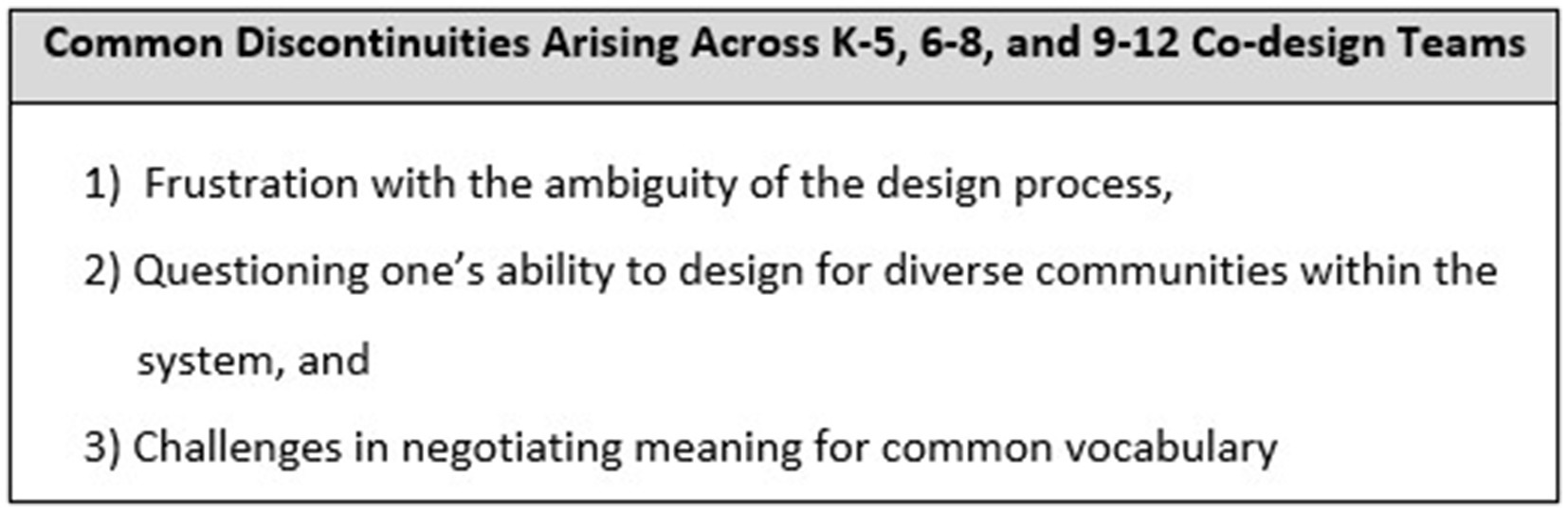 We begin this section by presenting the problem of practice chosen by each grand band team as background for reading about the discontinuities found in our analysis (see Table 1). Then, we address RQ1 by describing the situations and conditions under which three common discontinuities arose multiple times in each of the three grade bands as they identified a statewide problem of practice to address (see Figure 6). To answer research question 2, we describe how designed artifacts and activities, what we refer to as researcher-imposed since they were introduced by steering committees, supported teams in working through each discontinuity. The analysis will highlight that there were artifacts and activities that arose during the course of the work as well, i.e., emergently designed. In the discussion section, we tie the emergence of these discontinuities to their relevant dualities and reflect on the learning that was thus made possible.