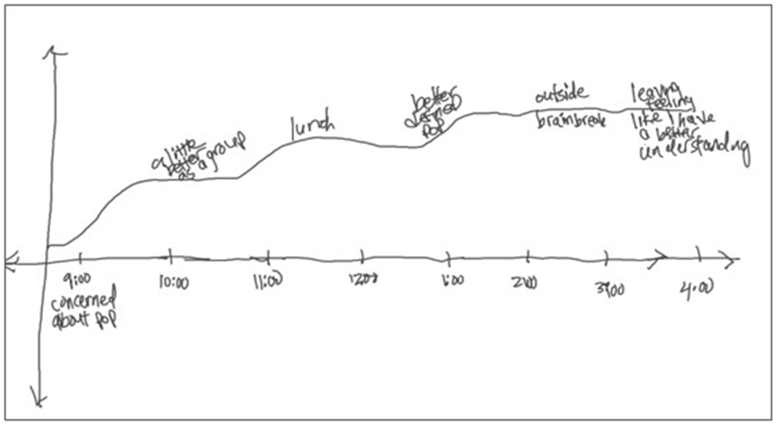 The data used for the analysis in this article came from a variety of sources. To understand what co-designers identified as the artifacts and activities that facilitated choosing a PoP, we examined written reflections in all 60 Designer’s Notebooks (20 Co-designers at each grade band). Specifically, we analyzed responses to the co-designers’ explanations of their drawings for the following prompt completed at the end of each of the 3 days (see Figure 5 for an example): Graph a “day in the life of a designer” on a set of axes and label the high and low points, with specific reasons for that designation. Regarding Steering Committee members, the Project Team conducted Focus Group interviews with each of the three grade band Steering Committees using the same set of prompts, some of which asked them to reflect on their role in facilitating the summer retreat (see Appendix A for specific questions). These interviews lasted between 30 and 45 min each. The focus group interviews were audio recorded and transcribed verbatim. Finally, each of the Project Team members responded to the same interview questions individually in written form, in an online format. Written responses averaged five pages per Project Team member.
