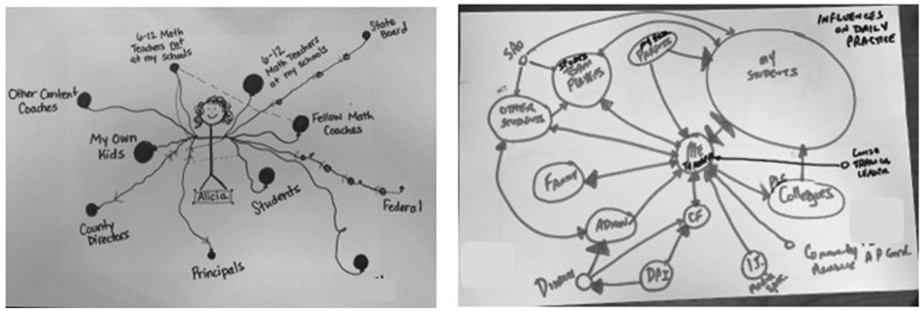 One activity that emerged as significant in negotiating the tension of systems thinking was to develop a systems map. All three grade band teams engaged in the systems mapping activity but adapted it according to their needs at the moment. Originally, co-designers were going to be asked to draw a map placing the mathematics classroom in the center of the state system and then draw nodes and connectors for all of the people that have an influence on their daily practice and on whom they have an influence. However, two grade bands slightly altered the activity by changing who was at the center. The K-5 team placed the classroom in the center (as originally intended), and the 6–8 and 9–12 teams placed the words instructional leaders or myself in the center, respectively (see Figure 8). Although the systems mapping activity was imposed by the Project Team, it was mentioned as a high point in many of the Designer’s Notebooks as it highlighted how each of the co-designers was a part of the system and where they had influence, a perspective that many, especially the school-based teachers and teacher leaders, had not considered before. In the words of one 6–8 co-designer, “[a] positive experience [today] was first seeing how others in different roles viewed the problem of practice and how they created the systems mapping from their perspective. At the same time, it was neat to see how similar the mappings were, but different language was used”.