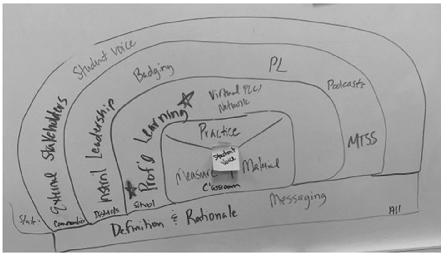 Within the grade band groups, co-designers engaged in activities such as The Five Whys and Systems Mapping (Penuel and Gallagher, 2017) in order to better define and understand their PoP as well as attend to the system-wide nature of the task. The Five Whys activity took small groups of co-designers through a sequence of five questions to determine the key problem their collaboration is trying to solve. At each iteration the group would ask itself and respond to the question of Why is this a problem? Drilling down deeper into the roots of the PoP. The Systems Mapping activity began with envisioning a classroom in which the PoP had been solved. From there, co-designers would map this vision to other aspects of the classroom, the school, the district, and the state levels that were supporting this classroom. These two activities were utilized for creating a deeper understanding of the chosen PoPs and how these problems are both locally relevant as well as situated within the larger educational system.