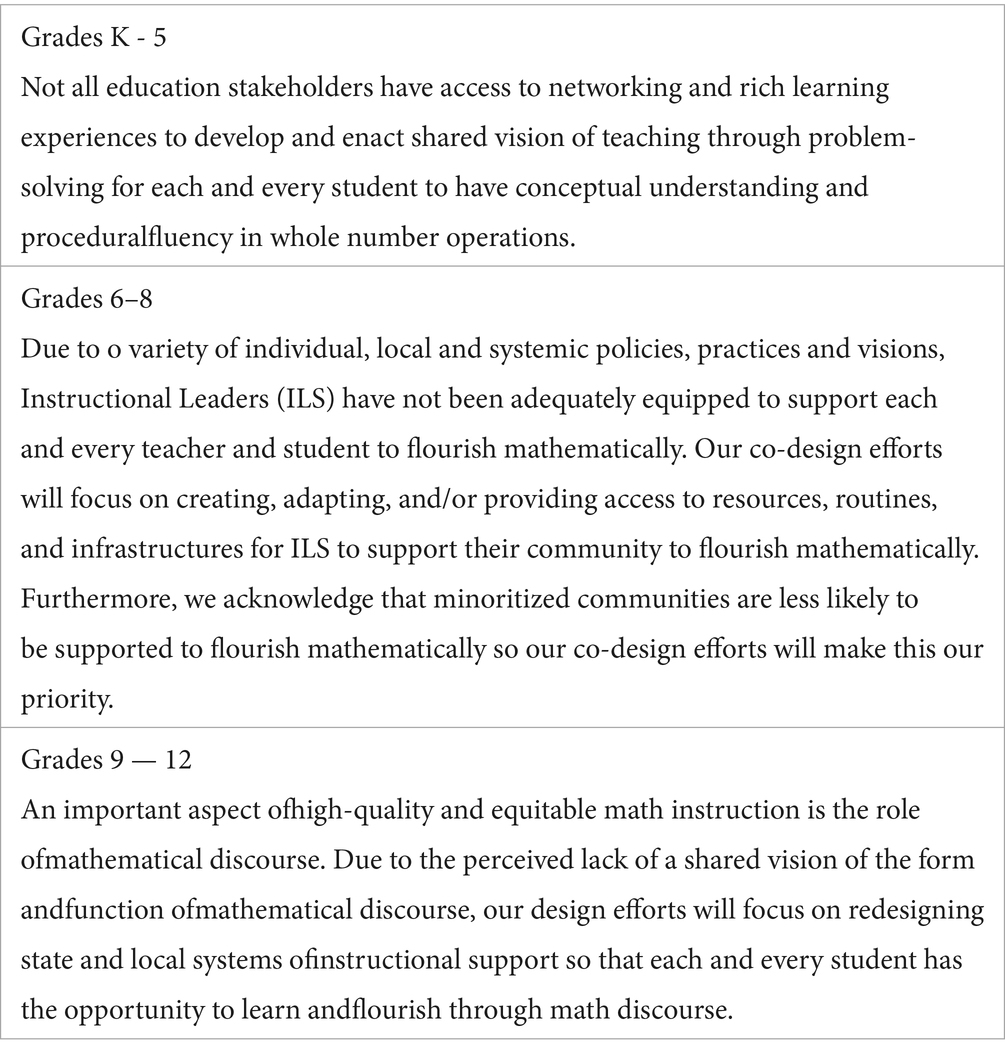 In 2016, the emerging statewide problem of practice for our RPP was defined for us by a policy change (the introduction of revised state mathematics standards). However, this new focus on co-designing for a state-wide VHQEMI offered us a unique opportunity to exercise more autonomy over determining a problem of practice for which disparate instructional visions is a root cause yet presented new challenges that are rarely discussed in research. RPPs begin, in part, with researchers and practitioners identifying shared goals for improvement and often a shared problem of practice (e.g., Cobb et al., 2020; Miller and Pasley, 2012; Munter et al., 2020; Van den Akker and Nieveen, 2021). A shared problem of practice (PoP) is a practical challenge that serves the needs of both researchers and practitioners and often involves multiple stakeholders working reciprocally to generate both theoretical and practical outcomes. According to much of the literature, RPPs are typically formed at the request of one of the partners who has a general problem or research interest that may serve as the basis for a more formal problem of practice. For example, in an RPP between a district and researchers in Washington, a superintendent approached researchers to conduct an audit of their newly adopted science curriculum (Penuel et al., 2013). As a result of this audit, researchers found that the materials had not been implemented in a manner that met the needs of their learners, and this became their shared problem of practice. In this case, as in many others, the PoP was identified around an issue that was of central concern of one of the partners. It is rarer to convene a group of diverse stakeholders with no particular pre-identified problem and define one together, especially at a state-wide scale. Such an approach presents an opportunity to empower partners to identify their own problems (cf. Munter et al., 2020) for which disparate system-wide vision may be a root cause, as well as understand the difficulties that arise when choosing a problem that addresses the needs of an entire state’s educational stakeholders.