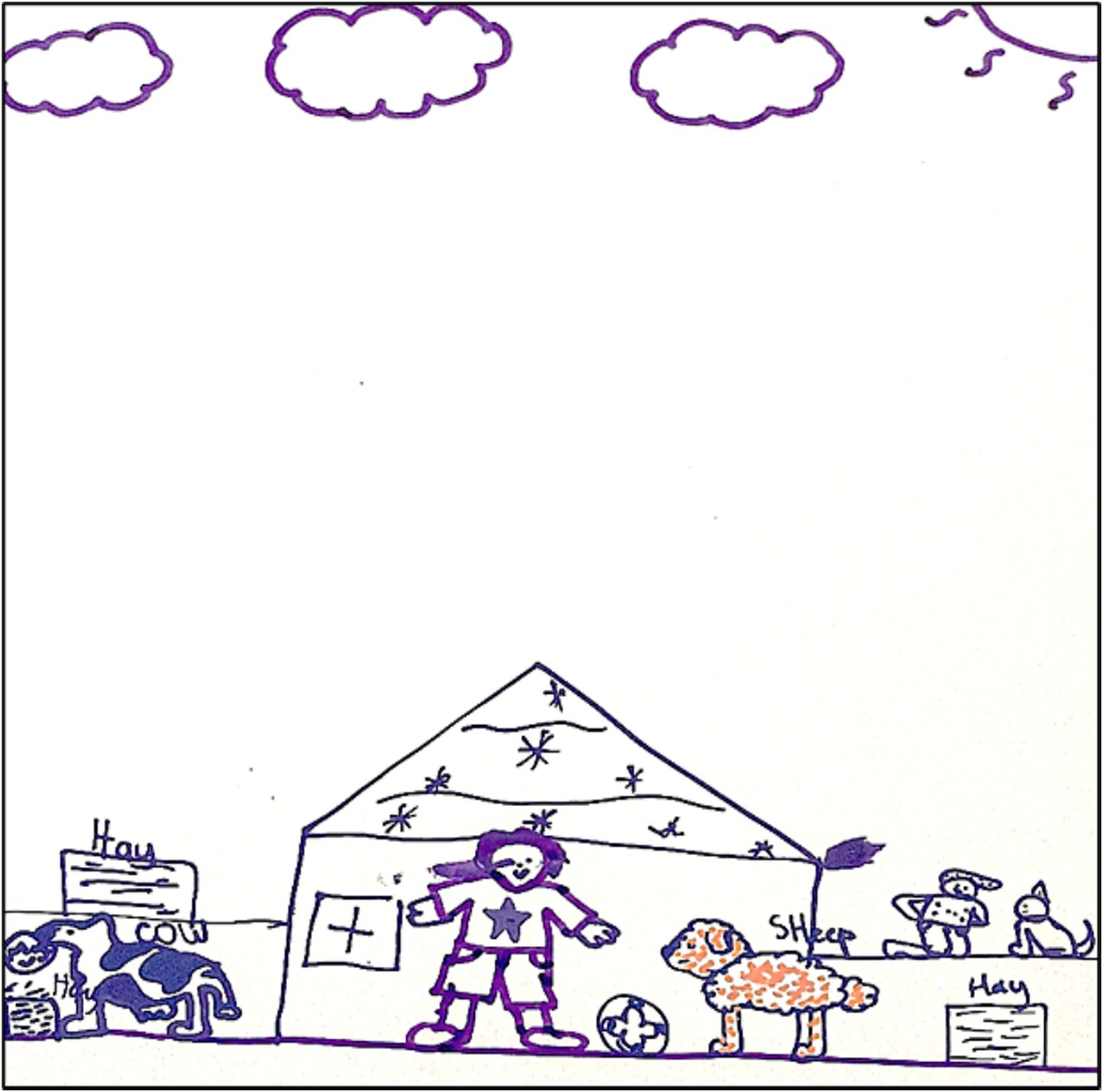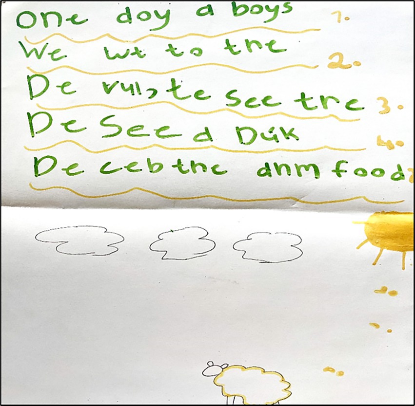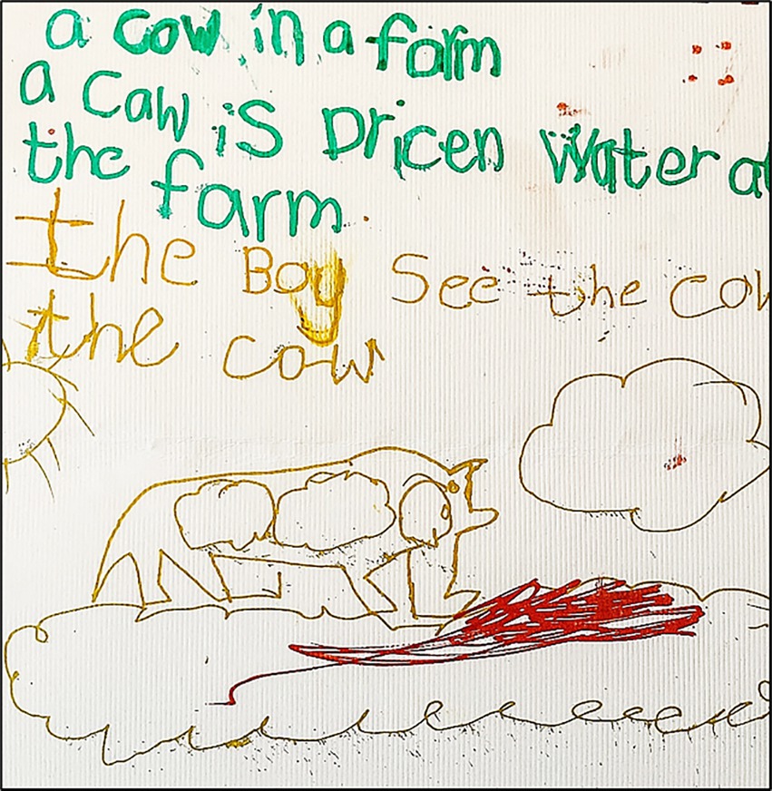 Nomsa’s drawing illustrates her attempt at writing a short paragraph and at drawing her understanding of the story. Her proficiency in English was low. She could, however, express her understanding of the comprehension passage through her drawing of a sheep on a farm. This shows the importance of the visual/artistic mode as it assists learners in expressing meaning more clearly visually than linguistically. When learners actively draw, potentially beneficial cognitive processes activate prior knowledge, increased attention, and better subsequent recall as new information is integrated into long-term memory (Ainsworth and Scheiter, 2021). Although there was no mention of a sheep in the passage, sheep count as farm animals. This expressed her understanding that the comprehension piece was about a farm and showed that she could draw from her personal lifeworld and activation of prior knowledge to make sense of the passage.
