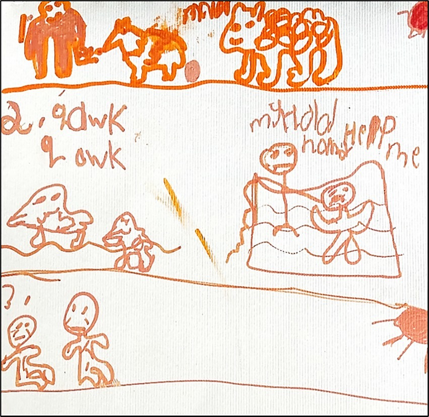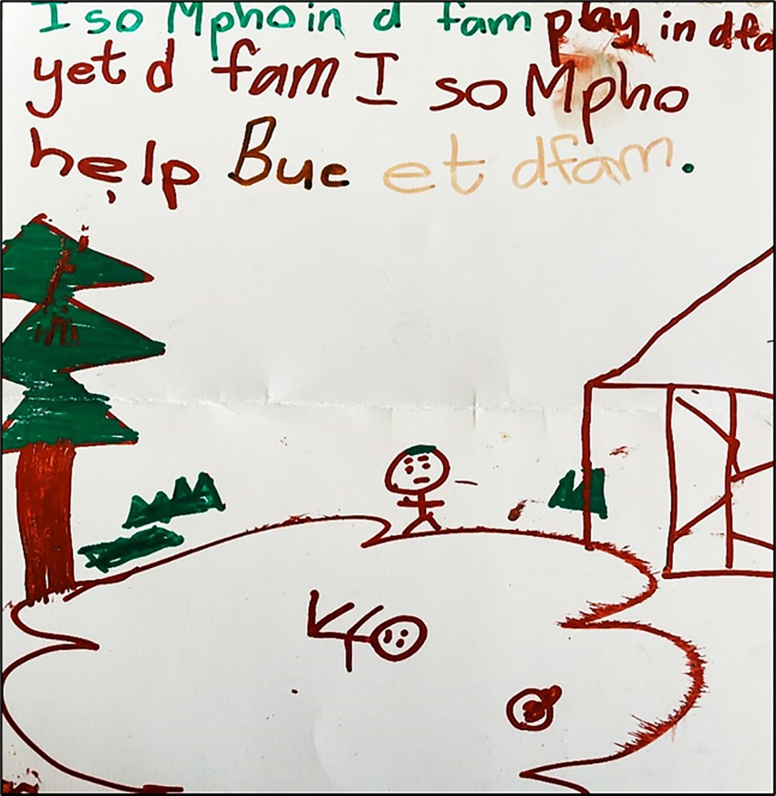 Figure 4 indicates that Thabo was also more successful in expressing meaning through his drawing than in writing. He was not able to express his understanding of the comprehension passage through his writing, but could verbally do so in class during the discussion, and visually through his drawing to conceptualise the story. It is evident that Thabo’s writing skills in English were limited. His drawing, however, includes someone drowning in what seems to be a pond. This illustrates his understanding of the plot of the passage. Through his drawing, Thabo was also able to explain the main events from the story. He was able to draw information explicitly stated in the text and explain the main ideas, which included that someone was drowning when they visited a farm.