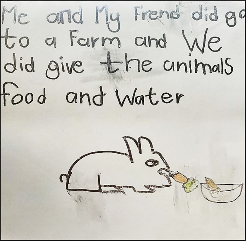 John’s writing ability in English (Figure 5) was more advanced than that of his classmates. He was able to write a short sentence related to his drawing of the visit to the farm. In his writing, he indicated that they went to the farm to feed animals. The animal that he and his friend fed was a rabbit, which he represented in a drawing of a rabbit being fed carrots. Even though a rabbit was not mentioned in the story, the learner understood that rabbits are farm animals and drew on his own life experience of visiting a farm and feeding rabbits.