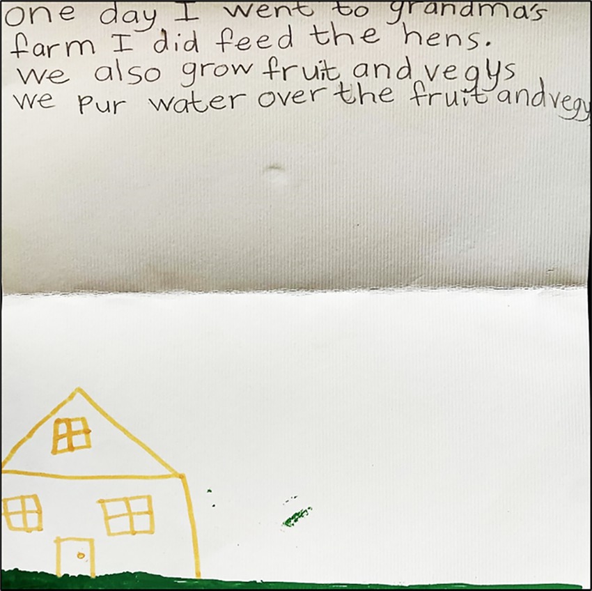 Jaden (Figure 8) decided to write a short story on his visit to his grandmother’s farm. He described how, on the farm, they fed hens and grew fruits and vegetables that they watered. Jaden merged his own experience with his written product of visiting his grandmother on her farm. In the story, there is no mention of growing and watering vegetables. Jaden drew on his own lifeworld in completing the activity in that fruits and vegetables are usually grown on farms. Jaden was able to make the link between home literacies and classroom literacies.