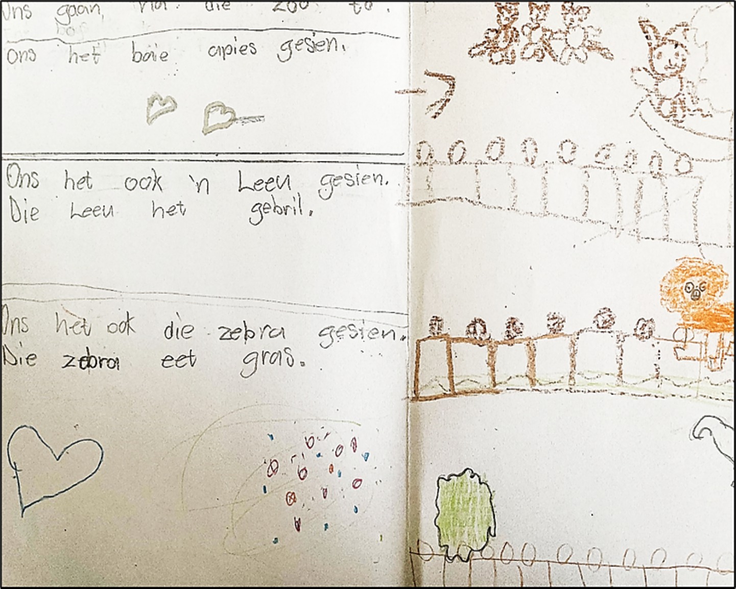 Jacob decided to write about and draw his visit to the zoo (Figure 9) even though the comprehension passage was about a visit to a farm. When the learners were asked if any of them had visited a farm and fed the animals, many of them put their hands up and related their experiences of farm visits and of visiting their grandparents on the farm. Jacob, however, told of his experience at the zoo and how he saw similar animals at school. He asked if he could rather write about and draw his visit to the zoo, and if he could write his story in Afrikaans. He wrote, ‘Ons gaan na die zoe to, ons het baie apies gesien’ (we are going to the zoo, we saw many monkeys). In the second section, he also wrote that he saw a lion and heard the lion roar (ons het a leeu gesien, die leeu het gebril). Lastly, he saw a zebra eating grass (ons het ook die zebra gesien, die zebra eet gras). Jacob drew on his personal experience of visiting the zoo and relayed it to the story of a visit to a farm. He made a link between the farm and zoo and how animals are found in both places.