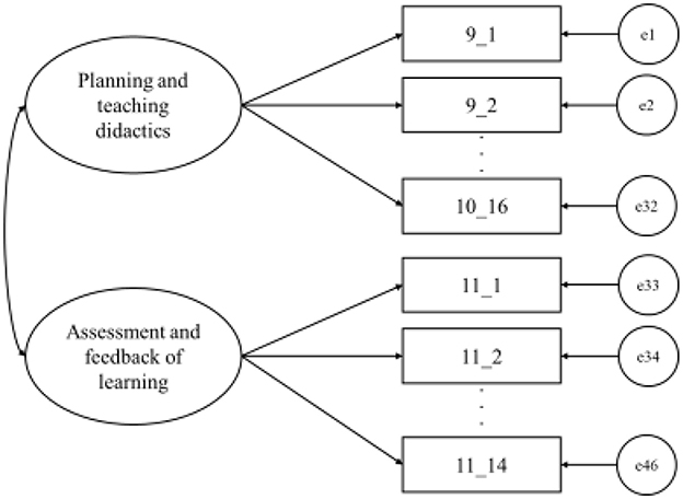 The two-factor model of the EEDDocente explained 68% of the observed variance. With the exception of items 9_15 and 10_6, the factor loadings and variances were adequate (Brown, 2015). The latent factor covariance index between factors was also found to be high (standardized r = 0.82), but theoretically possible. The model also met the criteria for a good fit (Hu and Bentler, 1999). The calculated indices suggest that the two-factor model has a good fit (x2 = 2,661.58, df = 989, p < 0.0, CFI = 0.995, TLI = 0.995, GFI = 0.993, NFI = 0.993, RMSEA = 0.034 [95% CI = 0.033–0.035], SRMR = 0.051). In addition, it is reported that the internal consistency indices are adequate in both factors with values above the established criterion of 0.70 (see Figure 1 and Table 4).