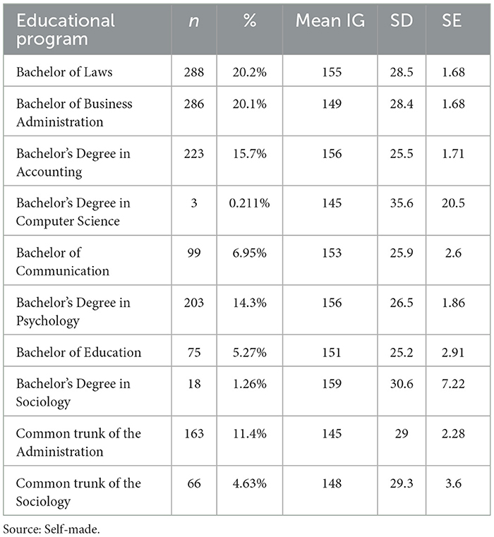 Table 1. Distribution and Mean IG of students participating in the EEDDocente 2023-1 according to the educational program in which they were enrolled.