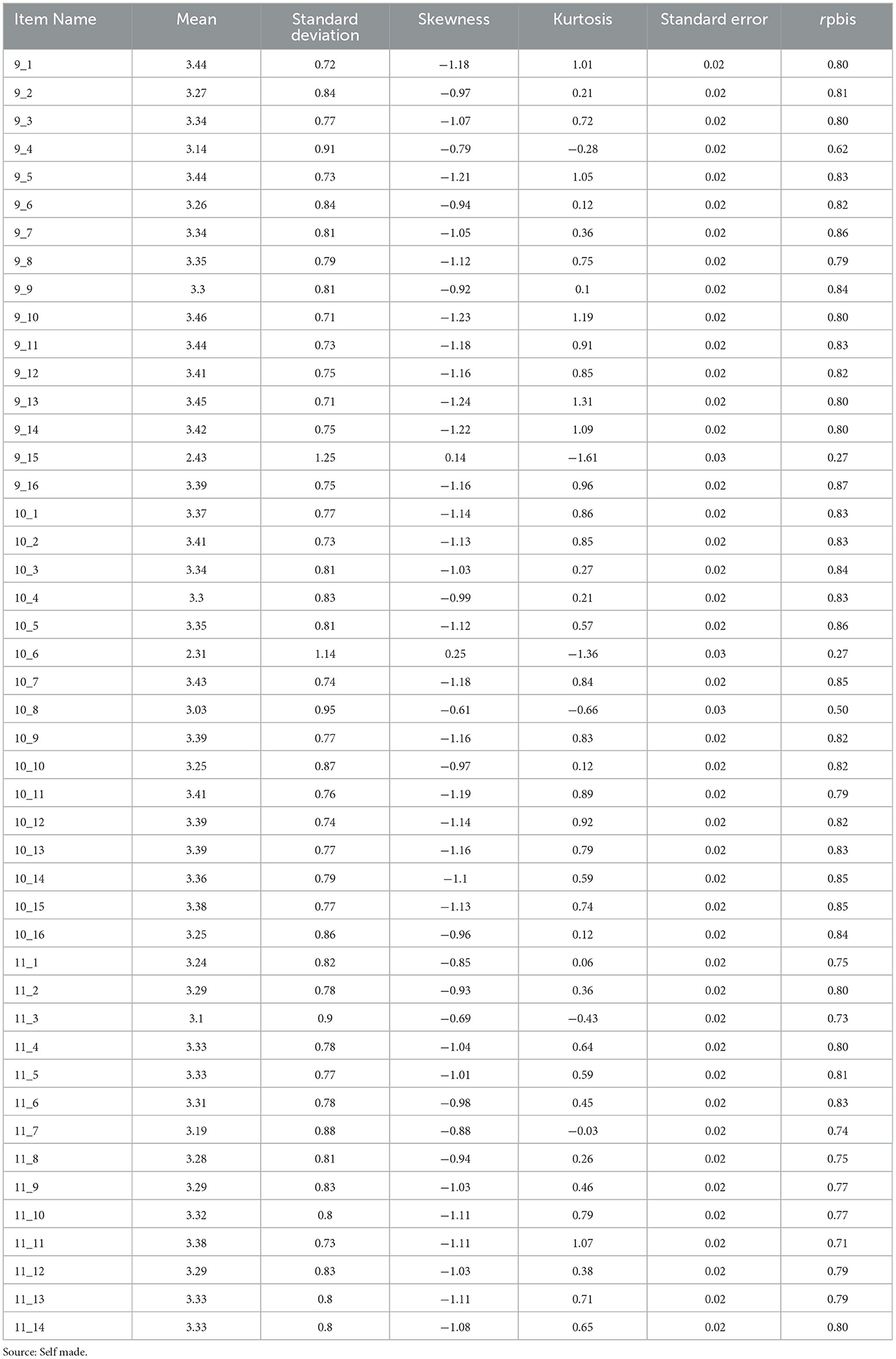 The mean GI score obtained in this study was 152.34 with a standard deviation (SD) of 27.74. The scores for each subscale of the EEDDocente were 53.23 (SD = 9.80) for the first, 52.95 (SD = 9.96) for the second, and 46.15 (SD = 9.48) for the third. Regarding the items, mean scores ranged from 2.31 (item 10_6) to 3.46 (item 9_10). The descriptive statistics for the items can be seen in Table 3.