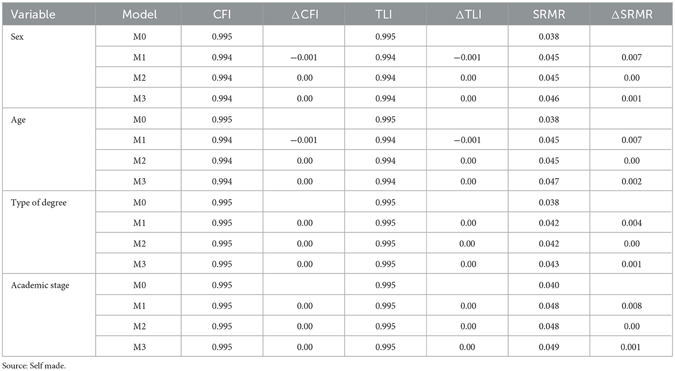 Factorial invariance of the two-factor model was verified based on the sociodemographic variables of sex, age, type of degree, and academic stage. Four models (M0-M3) were evaluated, providing evidence of invariance between the mean scores. In this regard, Table 5 shows adequate variation in the CFI (Δ < 0.01), as well as the TLI and SRMR (Δ < 0.015), across the four models of the variables analyzed. Based on the results, it can be assumed that the measurement is invariant across subgroups, and it is appropriate to compare their mean scores.