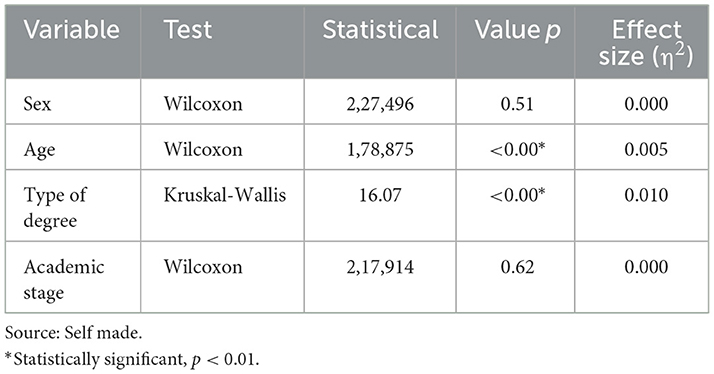 Finally, the mean scores of the subgroups that showed evidence of measurement invariance were compared. Neuhauser's (2021) recommendations were followed, using the Kruskal-Wallis rank-sum test to compare two groups, and the Wilcoxon rank-sum and signed-rank tests to compare more than two groups. Differences were calculated using nonparametric analysis techniques for ordinal variables. The criterion for determining significant differences was a p-value ≤ 0.05. The effect size was subsequently verified by calculating the eta-squared (η2) for variables that showed significant differences (Tomczak and Tomczak, 2014). Four comparative hypotheses were tested: the first working hypothesis (H1) considers that women, on average, are more likely to give high scores to their teachers. The second hypothesis (H2) proposes that middle-aged and upper-aged students have higher average scores than the younger group. The third hypothesis (H3) proposes that students in the disciplinary and terminal stages give higher average scores to their teachers than students in the basic stage. The fourth working hypothesis (H4) considers that students enrolled in programs belonging to the Social Sciences give higher average scores than students enrolled in programs belonging to the Economic and Administrative Sciences. By testing these comparative hypotheses, we aim to contrast and follow up on the studies carried out by (Baños et al. 2022), and (Bazán-Ramírez et al. 2021) in the line of research related to the differences in teacher performance from the perception of students according to sociodemographic and the educational context variables.