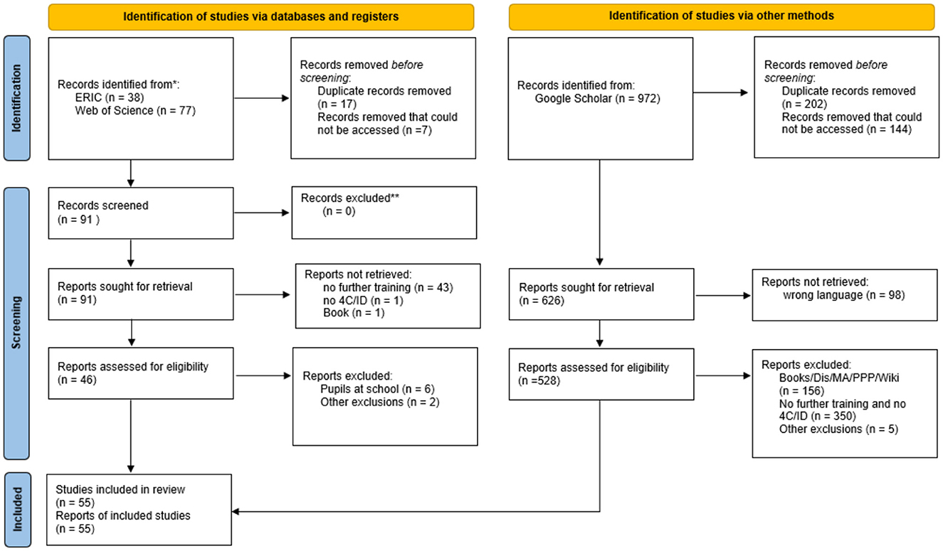 By following the PRISMA guidelines (Page et al., 2021) we decided to use “4C/ID” OR “Four-Component Instructional Design” for our search syntax to search the Eric and Web of Science databases. In both databases, we searched in title and abstract. We assumed that the most relevant studies are those that explicitly refer to 4C/ID in the title or abstract, rather than just mentioning it somewhere in the article. In such studies, it is plausible to assume that essential parts of the theoretical background can be traced back to 4C/ID. This resulted in 38 hits in ERIC and 77 hits in Web of Science. In total, we found 115 texts. For these 115 texts we had strict inclusion and exclusion criteria. We excluded: