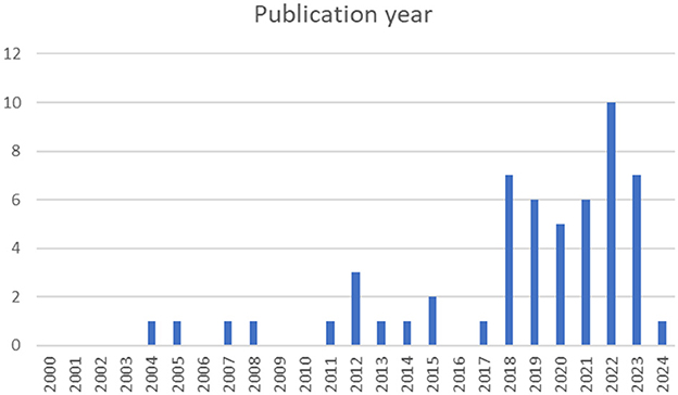 The analysis of the papers shows that the texts we consider relevant were published in the last 20 years, between 2004 and 2024. Since 2018, the average number of publications has increased eightfold. Figure 2 illustrates this trend.