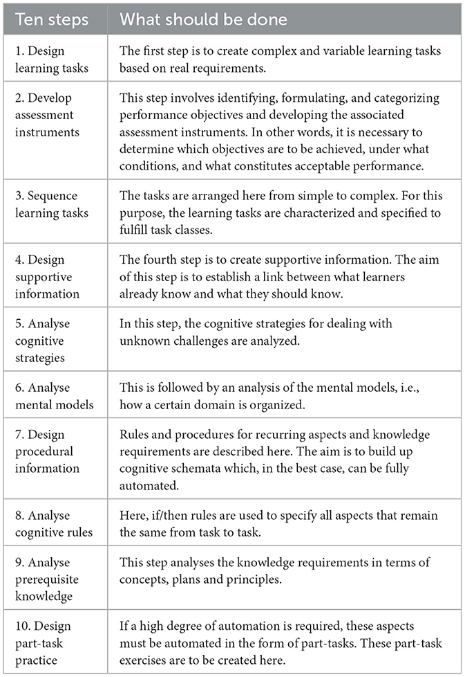 In addition to the four components that should enable competence-oriented learning, the model also lists 10 steps of design activities (van Merrienboer and Kirschner, 2012) to design courses fitting to the 4C/ID model. Within the 10 steps, the four components (steps 1, 4, 7 and 10) form a kind of super-category. The steps in between concretize the respective superordinate category. The first component “Learning tasks,” for example, is further concretized with the help of steps two and three. We consider a detailed description of the 10 steps in a published article as an indicator of successful implementation of 4C/ID—and summarize which information regarding each of those steps could be expected in Table 1.