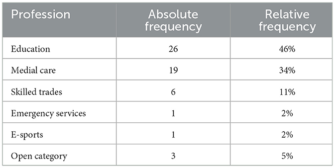 An important part of the evaluation of the texts was the analysis of the professional area in which the training courses were carried out. For this purpose, individual professions were summarized into categories. Ultimately, this resulted in the categories education, medical care, skilled trades, emergency services, e-sports and an open category for the rest. The “education” category includes teachers, university students, and vocational students whose subject-related training takes place within vocational schools. An example of this is the paper on further training for painting cars (Mulders et al., 2022). Students from a vocational school are described, but they are doing the training in painting cars with VR, i.e., these students were being trained in an activity that they had already learnt. The medical care category included doctors, nurses, medical students, nursing students and pharmacists. Skilled trades included painters and jewelry makers. Emergency services and e-sports included the mentioned professional group, and the open category syntheses the still open professions—including a first aid program, driving simulation training and a course to brush up on programming skills.