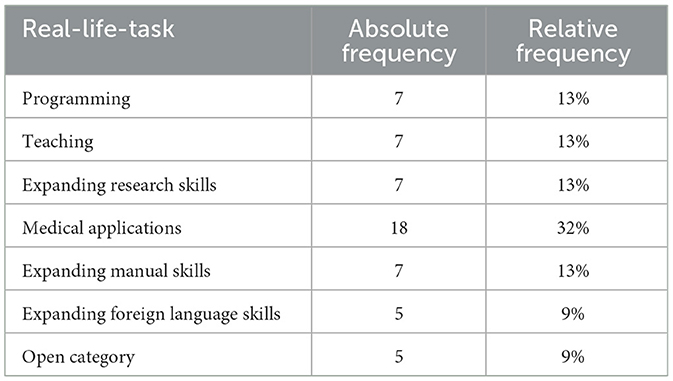 Finally, the real-life tasks that were to be improved with further training were categorized as programming, teaching, expanding research skills, medical applications, expanding manual skills, expanding foreign language skills and other. In the Other category, an exercise for evacuation by emergency services, driving with an automatic system, and the appropriate use of skills from video games in the real world were categorized.