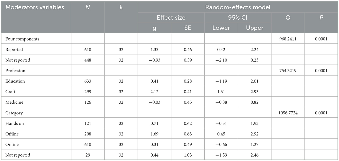To explore potential sources of heterogeneity, moderator analyses were conducted (Table 4). We first checked our hypothesis whether studies which report the four components for their 4C/ID program (indicating overall quality of the program) show higher effects than studies that do not explicitly report how the four components were implemented. In line with our hypothesis, the category “4 components reported” showed a significant pre-post effect [g = 1.33, SE = 0.46, 95% CI [0.42, 2.24]]; the category “4 components not reported” showed no significant pre-post effect [g = 0.39, SE = 0.37, 95% CI [−0.33, 1.12]]. However, the difference in effect size between “reported” and “not reported” was not statistically significant [g = −0.93, SE = 0.59, z = −1.58, p = 0.115, 95% CI [−2.10, 0.23]]. Compared to the overall model, the variance components in the first moderator model were slightly reduced: The between-study variance (σ12) decreased from 1.02 to 0.86; the within-study variance (σ22) stayed the same. The test for residual heterogeneity remained significant in the first moderator model [Q(30) = 968.24, p < 0.001], indicating that additional moderators or factors might explain the remaining variability. Model fit statistics for the first moderator model were AIC = 71.91 which suggest a better fit compared to the overall model.