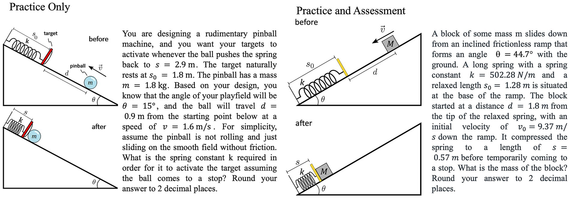 Figure 1. Example of isomorphic problems. The two problems involve identical physics principle, but differ in the detailed problem context (ball vs. block), direction of motion, and the known and unknown variables. Left: a problem used only in the practice. Right: a problem used in both practice and on the assessment.