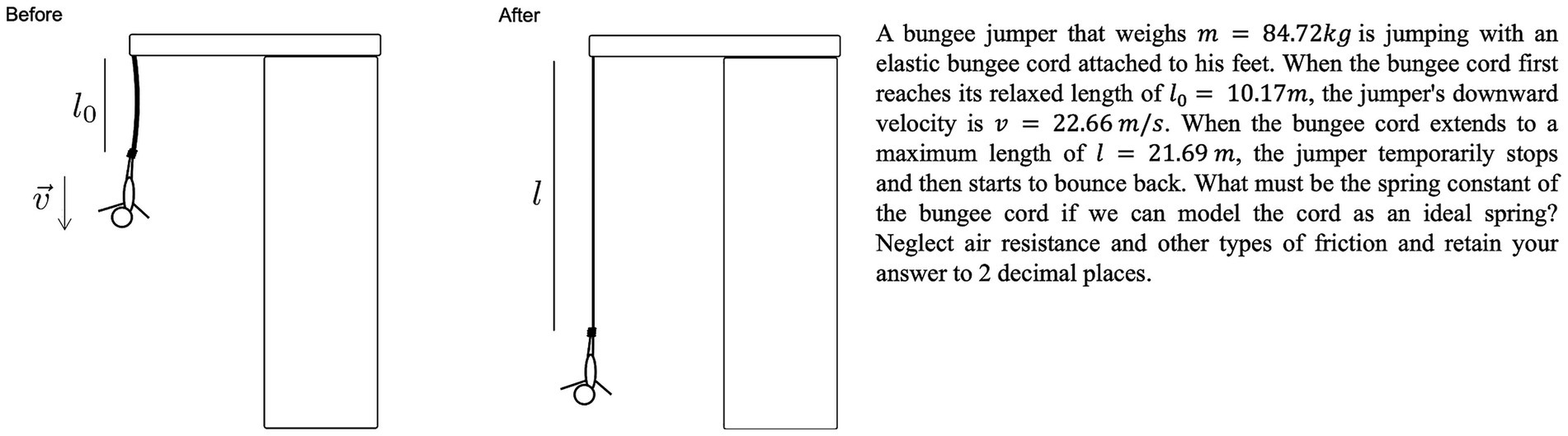 Question 4 was not present in the problem bank, but can be solved with identical process and identical set of concepts as problems in the problem bank. As shown in Figure 2, Question 4 asks about a person doing bungee jumping under a bridge, and the two versions of Q4 refers to the person moving either up or down in direction. The problem context of Q4 can be seen as an isomorph of that of Q6, with the only difference being the absence of a ramp. As a result the symbolic solution of Q4 was very similar but mathematically slightly easier that of Q6. We will refer to Question 4 as the Transfer problem. All other settings of Question 4 are identical to that of Question 6.