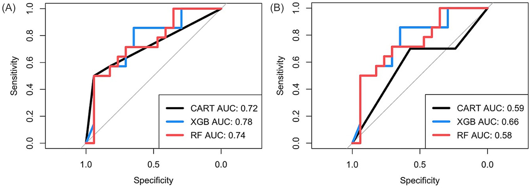 Figure 3. ROC curve plot comparing the performance of three models, CART, XGBoost (XGB), and Random Forest (RF), for the assessment problems. (A): Original problem. (B): Transfer problem.