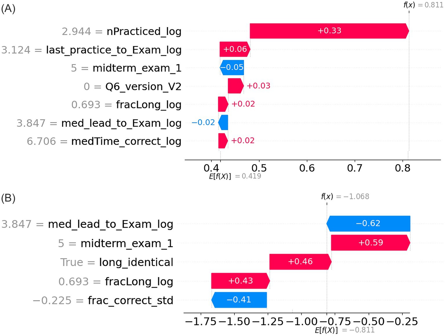 For the XGBoost model predicting Transfer problem (Figure 4B), the initial expected value of log-odds was −0.81 before considering feature-specific contributions. After accounting for all feature effects, the final predicted log-odds was adjusted to −1.07. Feature importance was different from that of the Original problem model. As shown in Figure 4B, the most influential feature was median time separation between practice problem and exam (med_lead_to_Exam_log), with a log-odds change of −0.62 when the median time separation was about 47 h, or 1.96 days. The midterm exam 1 of 5 points positively impacted the log-odds by +0.59. Practicing identical problems long time (long_identical) also positively influenced the Transfer problem, contributing a log-odds increase of +0.46. The fraction of practice problems in long duration (fracLong_log) contributed to log-odd of +0.43 when the fraction was 0.99. Conversely, the fraction of correctly solved practice problem (frac_correct_std) negatively contributed the log-odd of −0.41 when the fraction of correctly solved practice problems was 0.05.