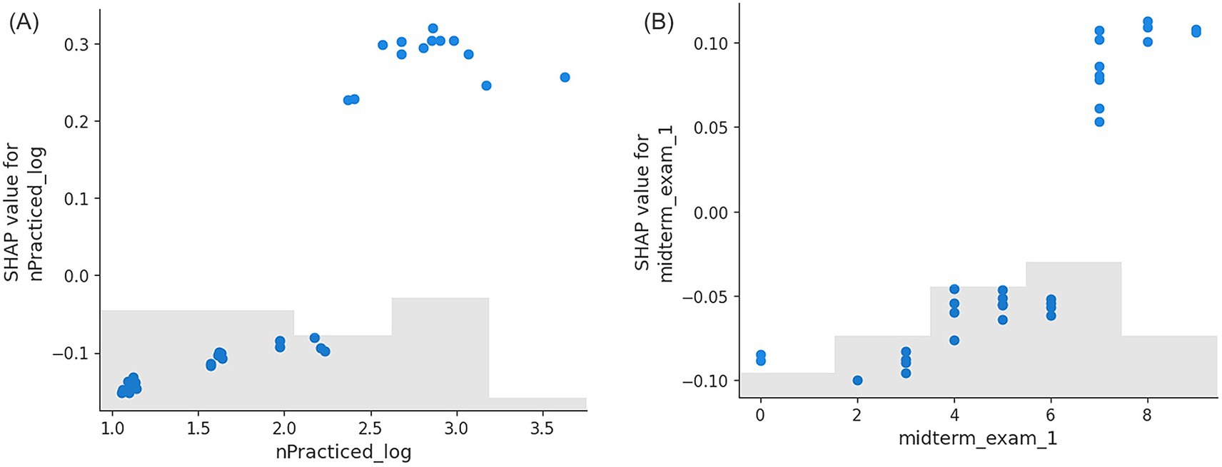 For the RF model predicting the Original problem outcome (Figure 4A), the expected value of log-odds before considering any feature-specific contributions was 0.42, and the final predicted log-odds after accounting for all feature effects was 0.811. Among all features, the number of practiced problems attempted (nPracticed_log) had predominantly the largest impact on the outcome, contributing +0.33 to the log-odds of the positive original outcomes when students practiced approximately 18 questions. From the scatter plot (Figure 5A) we can see that the positive SHAP value is exclusive to students with 10 or more problems practiced. The second most impactful feature was the time separation (in hours) between last practice problem and exam, which added +0.06 to the log-odds when students practiced 22 h before the exam. Surprisingly, midterm exam 1 score had the highest negative contribution of −0.05 to the log-odds for a score of 5 out of 10 points. Examining the scatter plot in Figure 5B revealed that the mid-term 1 score under 6 had negative contribution to the SHAP value, whereas scores >6 had positive SHAP value contribution. When the Q6 question was not version 2, it had an impact of +0.03 on the log-odds. Finally, the fraction of practice problems with long duration (fracLong_log) contributed positively with an addition of +0.02 to the log-odds of the positive original outcomes, when the fraction of the practice problems with long duration was 0.99.
