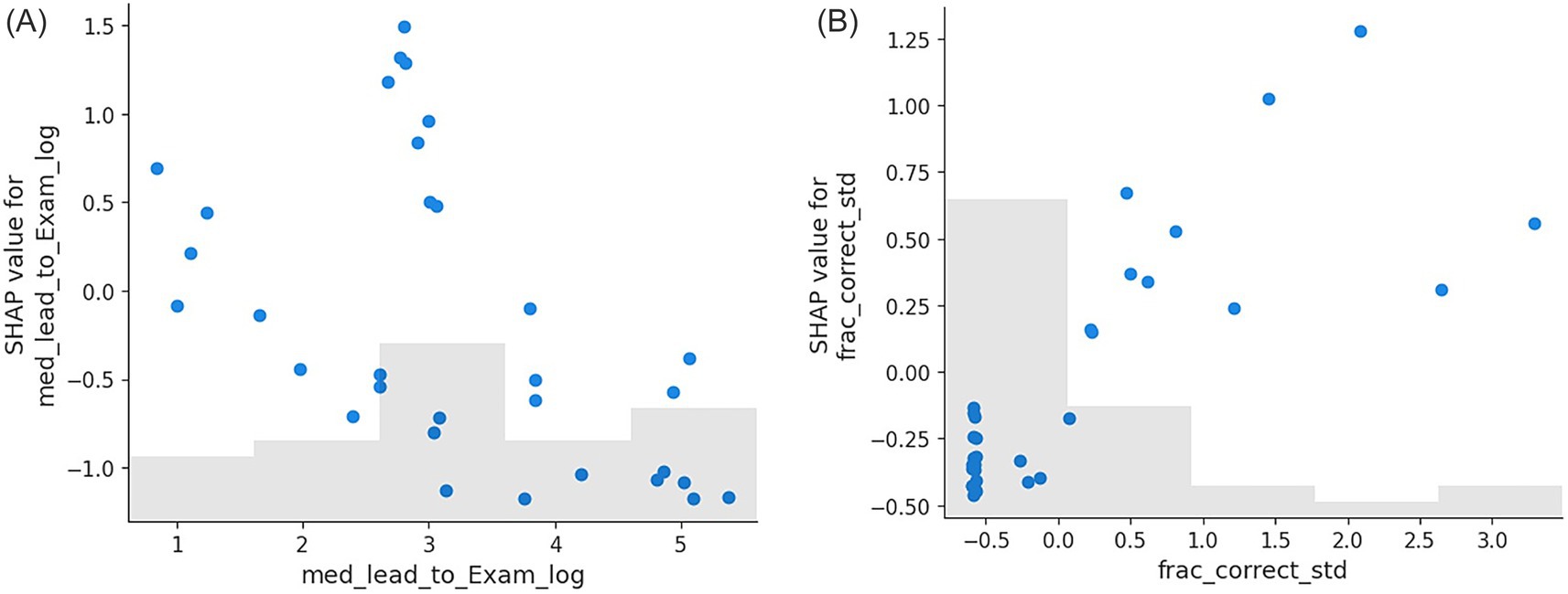 Since the direction of impact of med_lead_to_Exam_log and frac_correct_std are counter intuitive, we further examined the SHAP value dependence scatter plots of both features. As shown in Figure 6, it turns out that med_lead_to_Exam has peak positive SHAP value at about 3 (or about 1 day prior to the exam), and the SHAP value is negative when the feature value is greater than 3. For frac_correct_std, a higher correct fraction generally corresponds to a higher and positive SHAP value. Only when the feature value was below zero, which corresponds to roughly no correct attempt, did the SHAP value become negative. However, due to the large number of students with zero correct fraction, a negative SHAP value is reflected on the waterfall plot.
