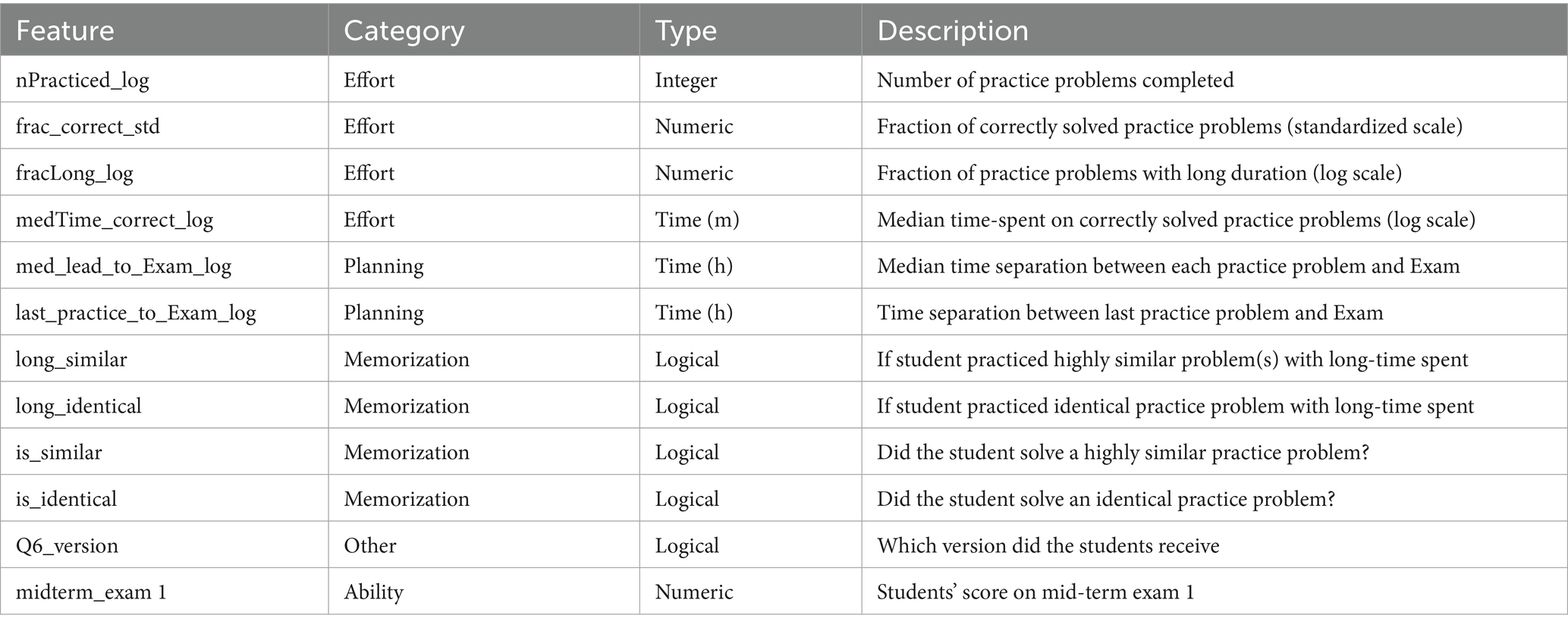 From the log data collected from students’ interaction with practice problem bank, we engineered 10 features related to students’ practice behavior on the isomorphic practice problem bank, most of which can be categorized to the following four categories, and explained in Table 1:
