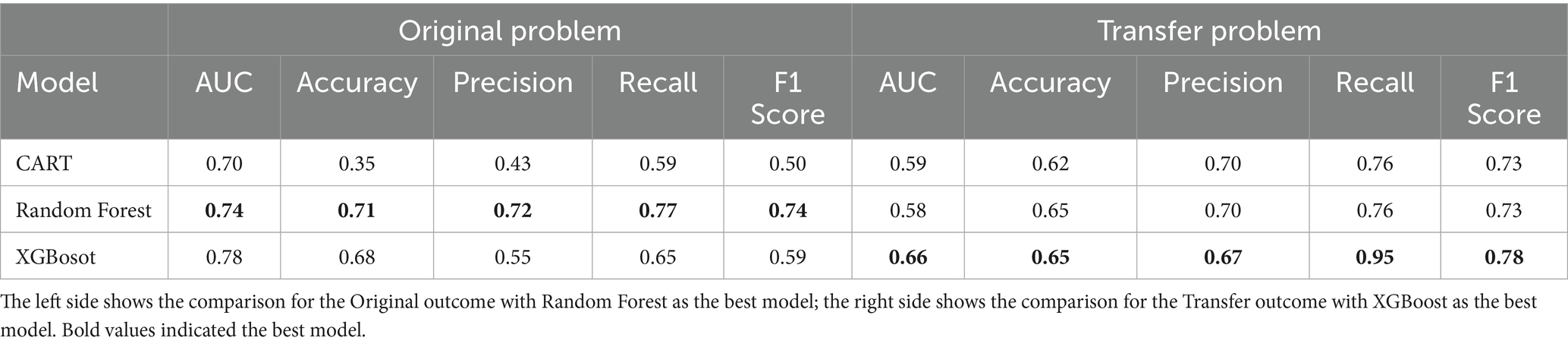 Best model for Transfer problem: As shown in Figure 3B; Table 2, the XGBoost model outperforms the other two models on all five metrics, achieving the AUC value of 0.66, the accuracy of 0.65 and the F1 score of 0.78. Note that the AUC values of all three models are all lower when predicting Transfer problem outcomes, indicating that all models’ predictive performance is less robust when predicting the performance of Transfer problems compared to predicting the performance on the Original problem.