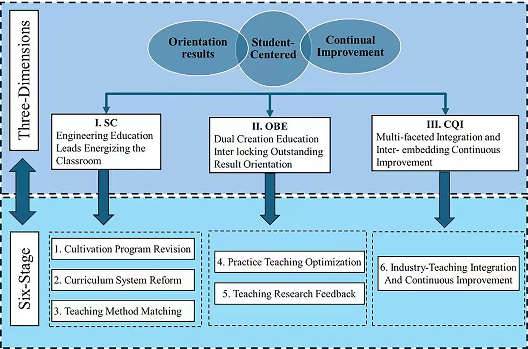 The general standards for engineering education specify requirements across seven dimensions: “Students,” “Educational Objectives,” “Graduation Requirements,” “Continuous Quality Improvement,” “Curriculum System,” “Faculty,” and “Supporting Conditions.” Based on the institution’s actual circumstances, the three dimensions of “Student-Centered (SC), Outcome-Based Education (OBE), and Continuous Quality Improvement (CQI)” are together adopted as the primary methodology for implementing engineering education. The concept of dual-creation education is embedded into the six phases of the engineering education implementation plan: Cultivation Program Revision, Curriculum System Reform, Teaching Method Matching, Practice Teaching Optimization, Teaching Research Feedback, and Industry-Teaching Integration and Continuous Improvement. This study proposes a “three dimensions-six stages” cultivation mechanism. This approach is designed to achieve the educational objectives of cultivating highly skilled engineering talents. The specific ideas of this study are as follows: