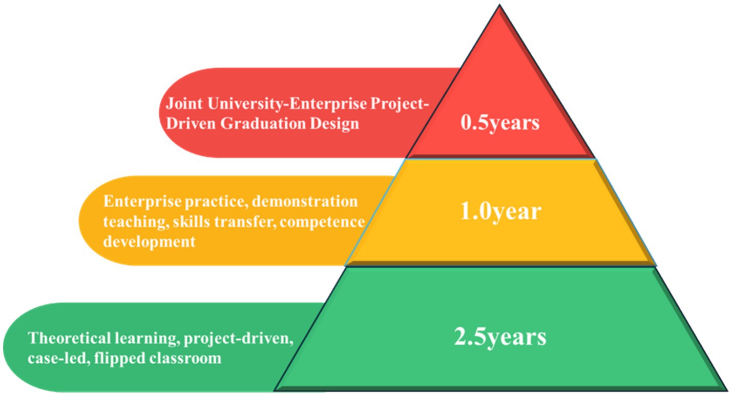 (1) 2.5-years of theoretical studies in school: students will complete the relevant theoretical courses within this time frame. At this stage, the implementation, evaluation, and safeguarding of the curriculum are carried out on the basis of school-enterprise cooperation. (2) 1.0-year enterprise practice training phase: students undergo 1 year of practice training in enterprises, and teaching is organized by enterprise practice teachers. This phase is based on demonstration teaching, supplemented by production practice. It also attaches importance to cultivating students’ professional ability in enterprises’ production practice (Hu, 2023). (3) 0.5-year joint university-enterprise graduation design stage: in the last half of the year, students take part in joint university-enterprise projects. These projects drive the graduation design process. It helps strengthen students’ comprehensive application skills. It also improves students’ ability to solve practical problems.