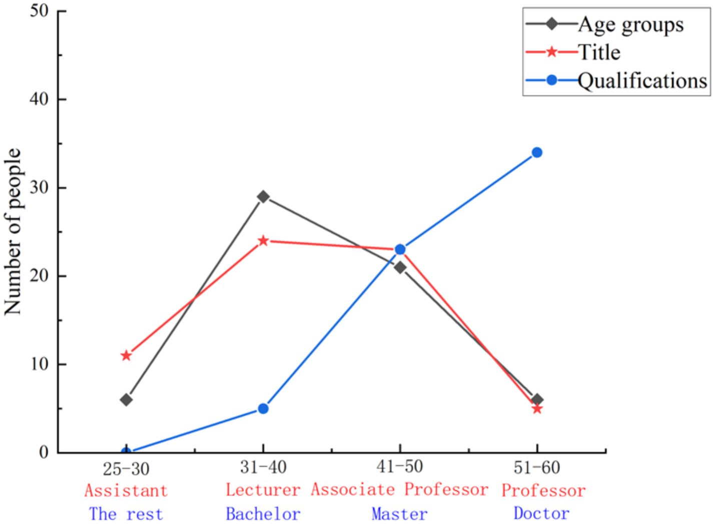 The analysis of questionnaire data from 64 teachers involved in innovation and entrepreneurship guidance at Zhengzhou University of Light Industry reveals that, in terms of gender composition, there are slightly more male teachers than female teachers (34 vs. 30). This follows the general trend of more male than female teachers in science and technology universities. The relatively small gender difference highlights the higher participation of female teachers at this university. It suggests that the university has taken effective measures in policy support, resource allocation, and management to promote innovation and entrepreneurship education and encourage teacher involvement in teaching reform. The distribution of teachers’ titles (see Figure 6) follows a normal distribution, with higher participation from teachers holding intermediate and associate titles. These teachers, as the core faculty of the school, play a key role in higher education teaching and bear the significant responsibility of dual-creation and engineering education (Zhao, 2022). As shown in Figure 6, the academic structure of the teaching team exhibits an upward trend, with teachers holding doctoral degrees accounting for 53% of the total. This clearly reflects the strong implementation of national and school policies by highly educated teachers. Their expertise not only fosters a solid integration of academic research with teaching but also promotes the interdisciplinary study. These teachers are instrumental in leading educational innovation by continuously exploring new teaching concepts and advancing the development of inter-embedded teaching models. In terms of age, the highest proportion of teachers are within the 31–40 age group, with a noticeable decline in participation as age increases beyond 41. This shows that as national education reforms advance, more young teachers are joining the transformation of higher education. They are driving deeper reforms in inter-embedded teaching models within innovation, entrepreneurship, and engineering education.