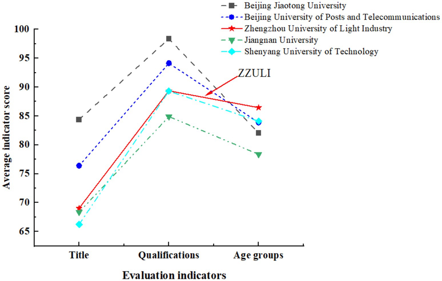 A survey was also conducted on 73 innovative teachers from Beijing Jiao tong University, 49 from Jiangnan University, and 164 from Shenyang University of Technology. Based on the analysis of the survey questionnaire and the calculation using quality evaluation function, Beijing Jiao tong University scored 90.90 points, with an evaluation grade of ‘Excellent.’ The innovative teaching team at Zhengzhou University of Light Industry scored 82.68 points, with an evaluation grade of ‘Good.’ Additionally, Shenyang University of Technology scored 81.35 points and Jiangnan University scored 78.63 points (Figure 7). This shows that Chinese universities differ in their focus on engineering education, resource allocation, and the quality of innovative teaching teams. Our university has relatively good resource allocation for embedded teaching. However, we still need to learn from high-level universities to build a teaching team with high academic qualifications, senior titles, and a young age structure, which will promote the development of dual-creation education and engineering education.