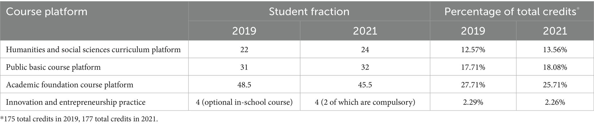 Analysis of changes in the overall distribution of course platforms between the old and new training programs (see Table 1) reveals that the university has increased the proportion of humanities and social sciences courses in the total credit count while reducing the proportion of basic academic discipline courses. The public foundation courses have been adjusted from 31 credits to 32 credits, with an increase of 16 credit hours, demonstrating the university’s commitment to strengthening basic education and providing a strong academic base for the cultivation of innovative talents. From Table 1, one can also see that, although the total credits for innovation and entrepreneurship practice courses remain unchanged, the four-credit elective for innovation practice has been adjusted to a two-credit mandatory course plus a two-credit elective. This adjustment demonstrates how the university has effectively embedded the concept of dual-creation education into its engineering talent cultivation program by optimizing the course structure, highlighting the significant emphasis placed on innovation and entrepreneurship education.