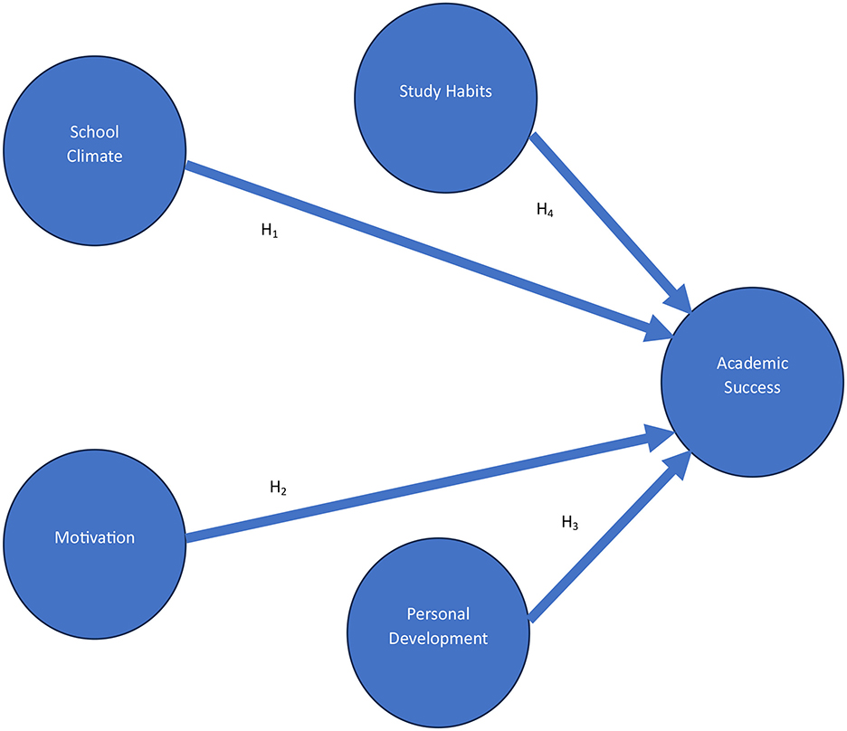 The study explored the relationship between school climate, motivation, personal development, study habits, and academic success in flexible learning environments. Its connections are illustrated in the structural model in Figure 1.